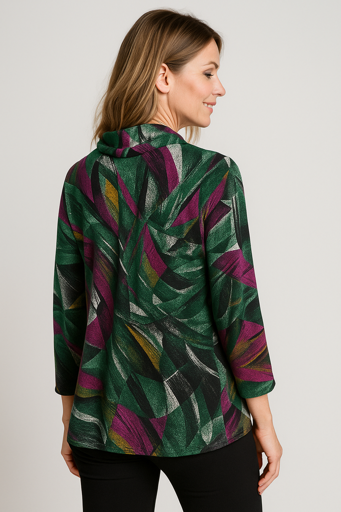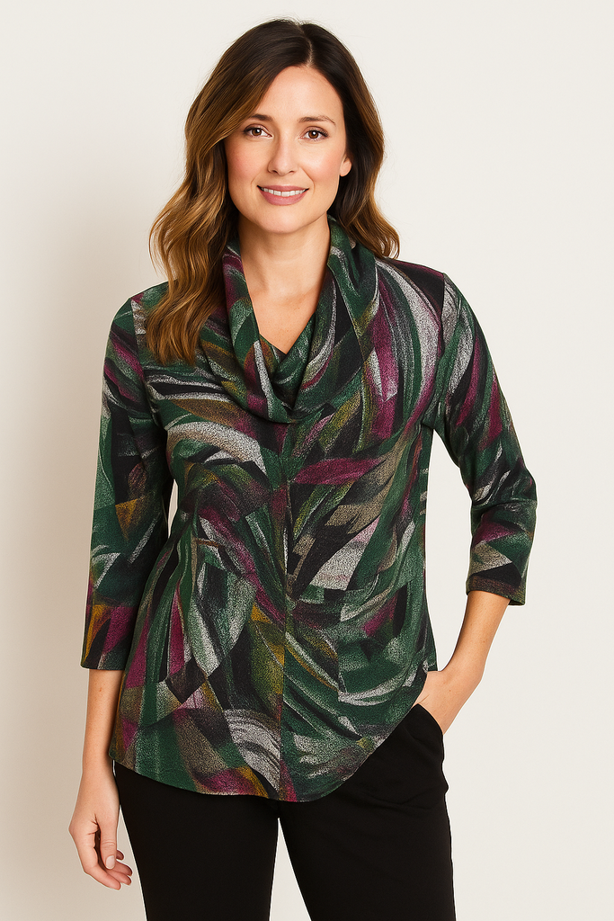 TO30400 ABSTRACT PRINT COWL NECK 3/4 SLEEVE TOP GREEN MULTI