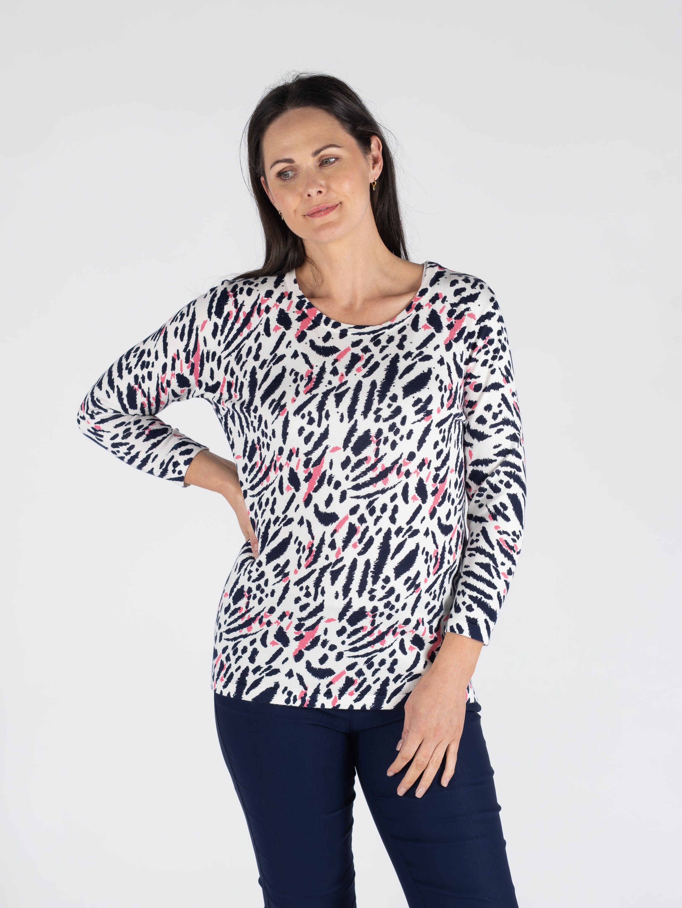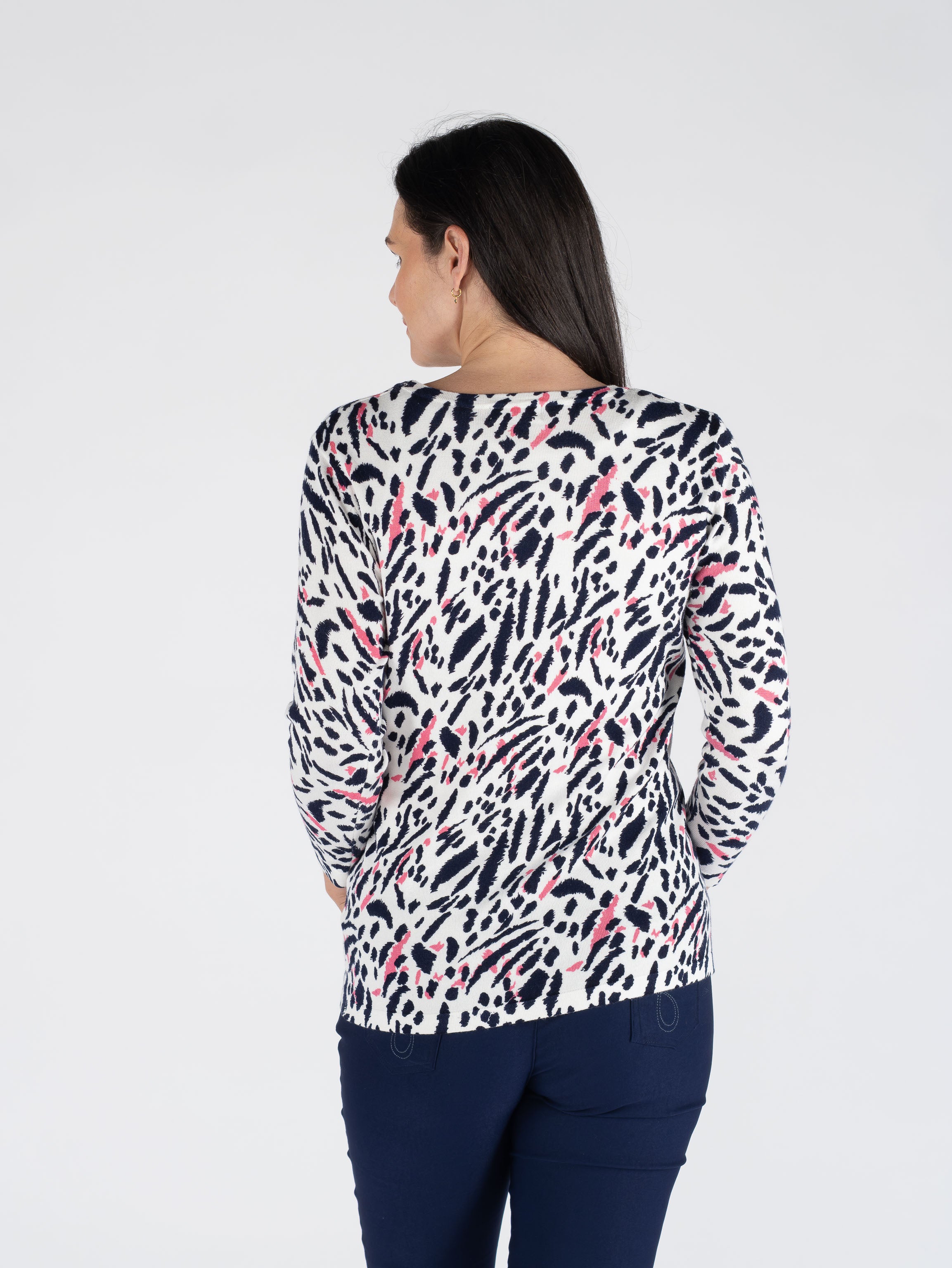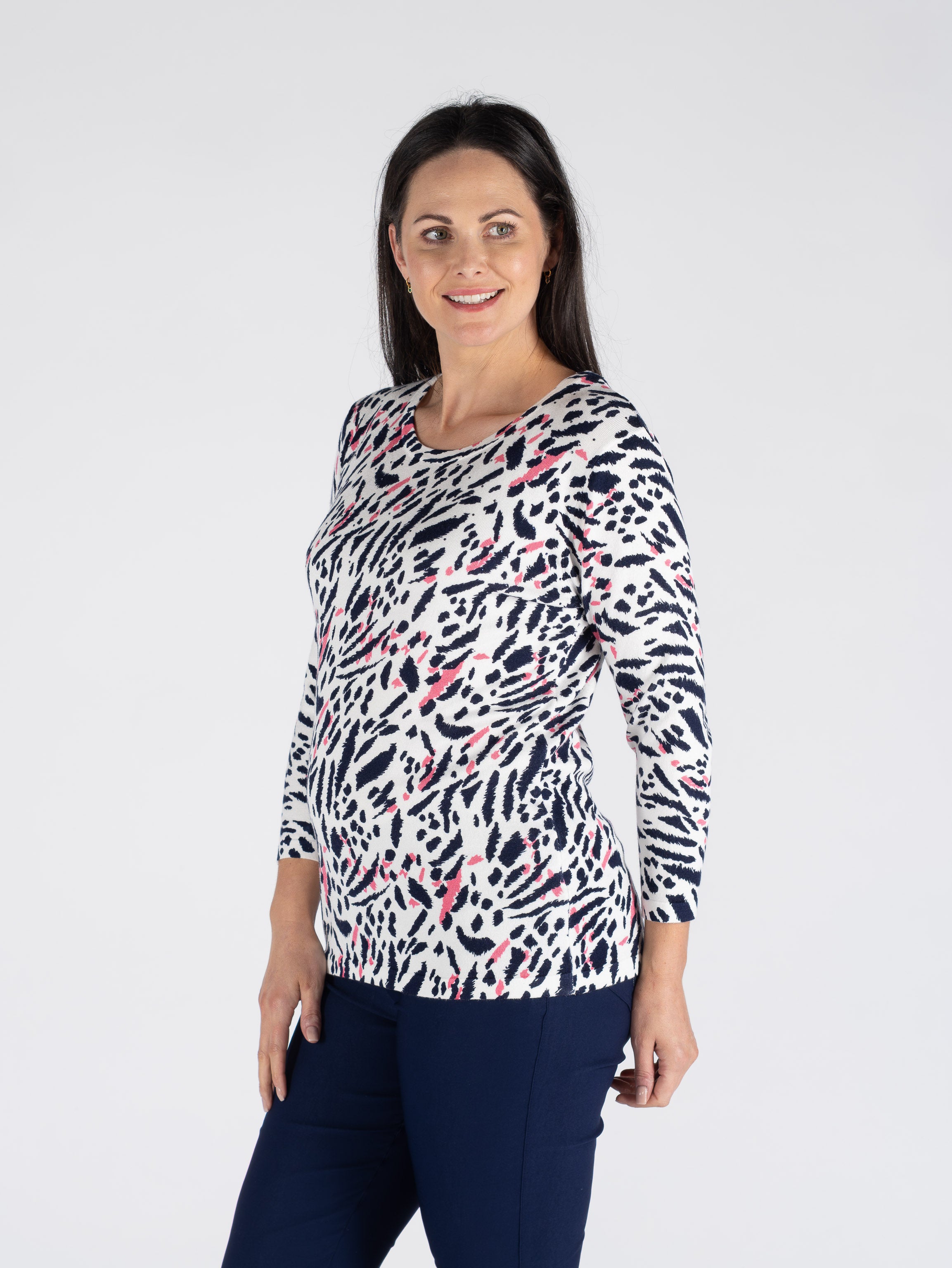 Embrace playful style with this animal print jumper, featuring a classic round neckline and comfortable three-quarter sleeves. The striking pink and navy colour combination brings a bold, contemporary edge to your everyday wardrobe. Perfect for layering or wearing solo, this versatile piece transitions effortlessly from casual outings to relaxed social gatherings. The animal print design adds personality and visual interest, making it an easy go-to for when you want to express your individual style without compromising on comfort.