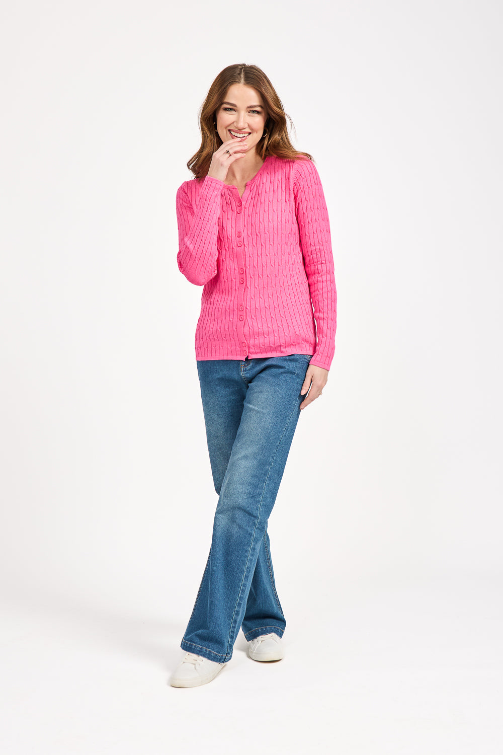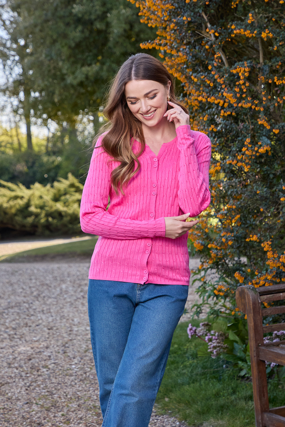 Designed with a flattering fitted shape and a classic button-through front, this cardigan is ideal for layering over tops, blouses or dresses. The cheerful pink colour adds a fresh, feminine touch while still pairing easily with denim, neutrals or lighter tones.