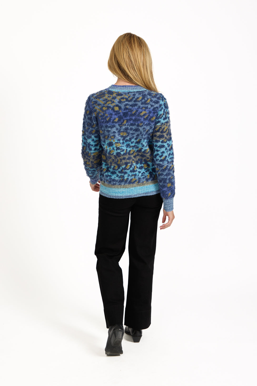 Fluffy Leopard Print Knit Cardigan BLUE