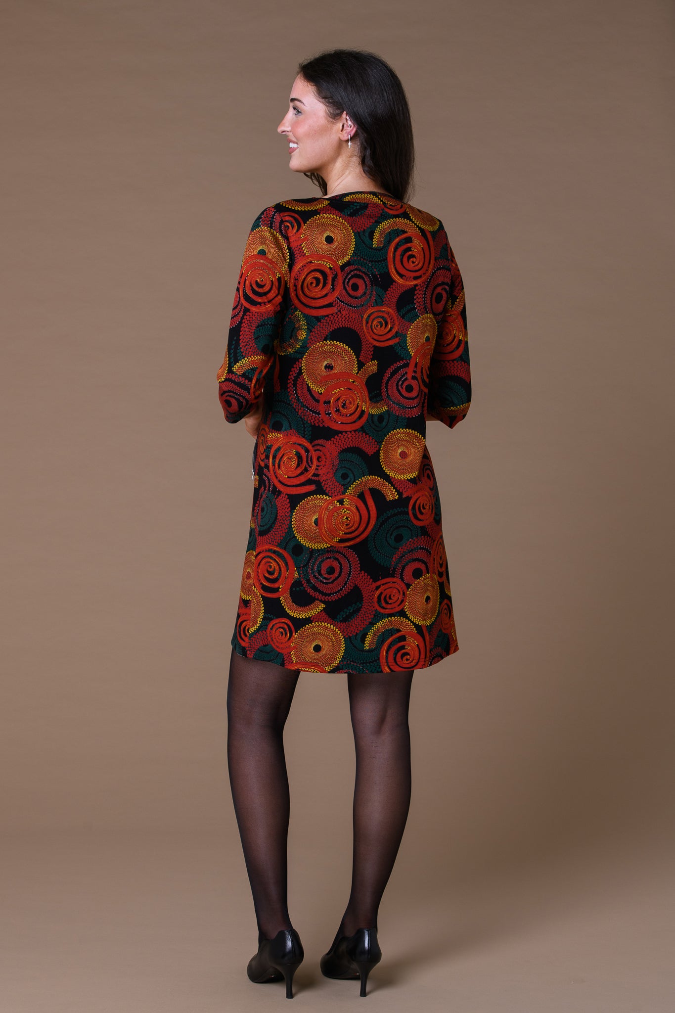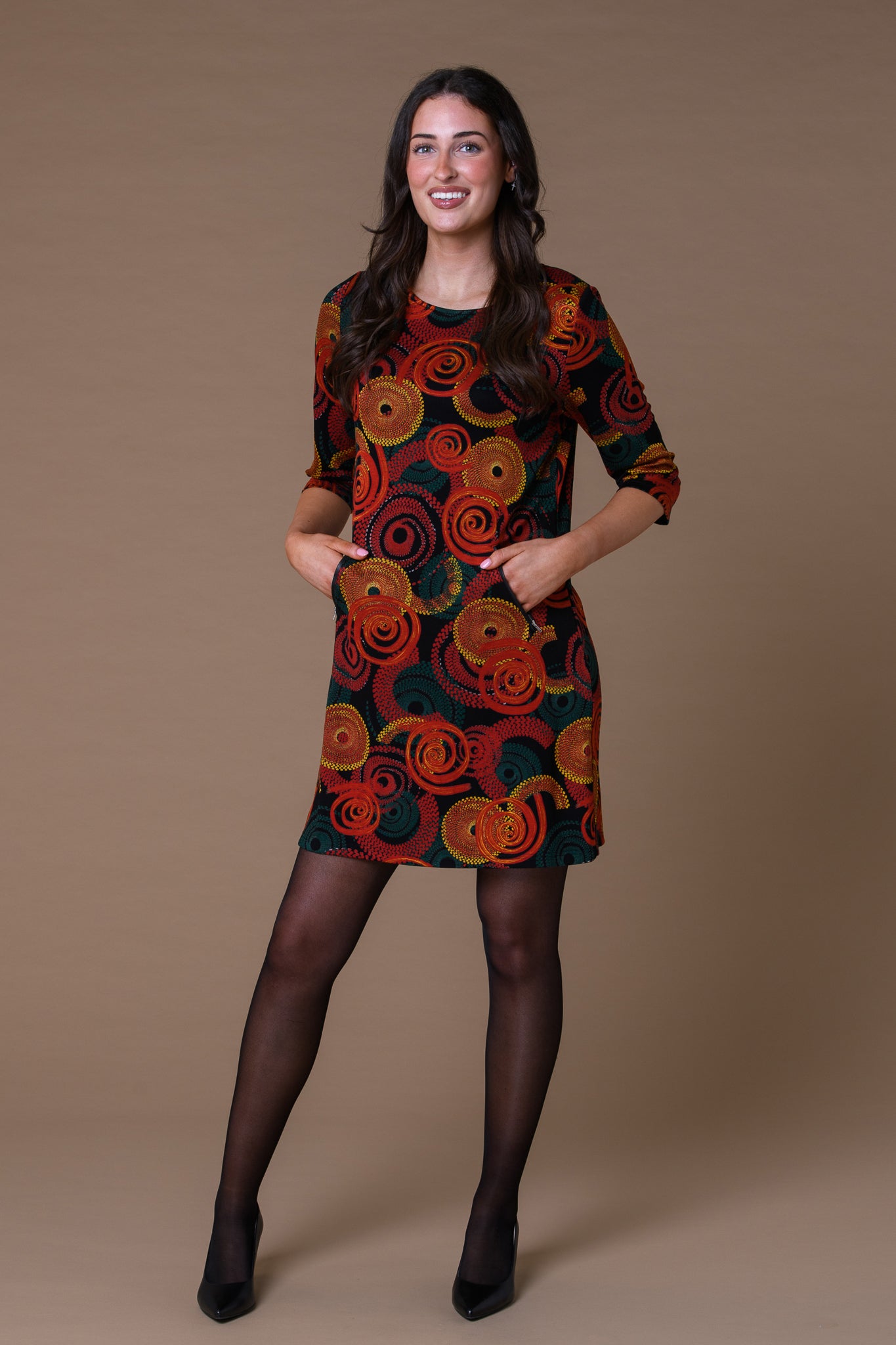 Make a stylish statement with this circles PU pocket dress. Designed with a modern circular print and faux leather pocket detailing, it combines comfort with contemporary flair. The soft, easy-to-wear fabric and relaxed fit make it perfect for everyday wear — just add boots or flats for an effortlessly chic look.