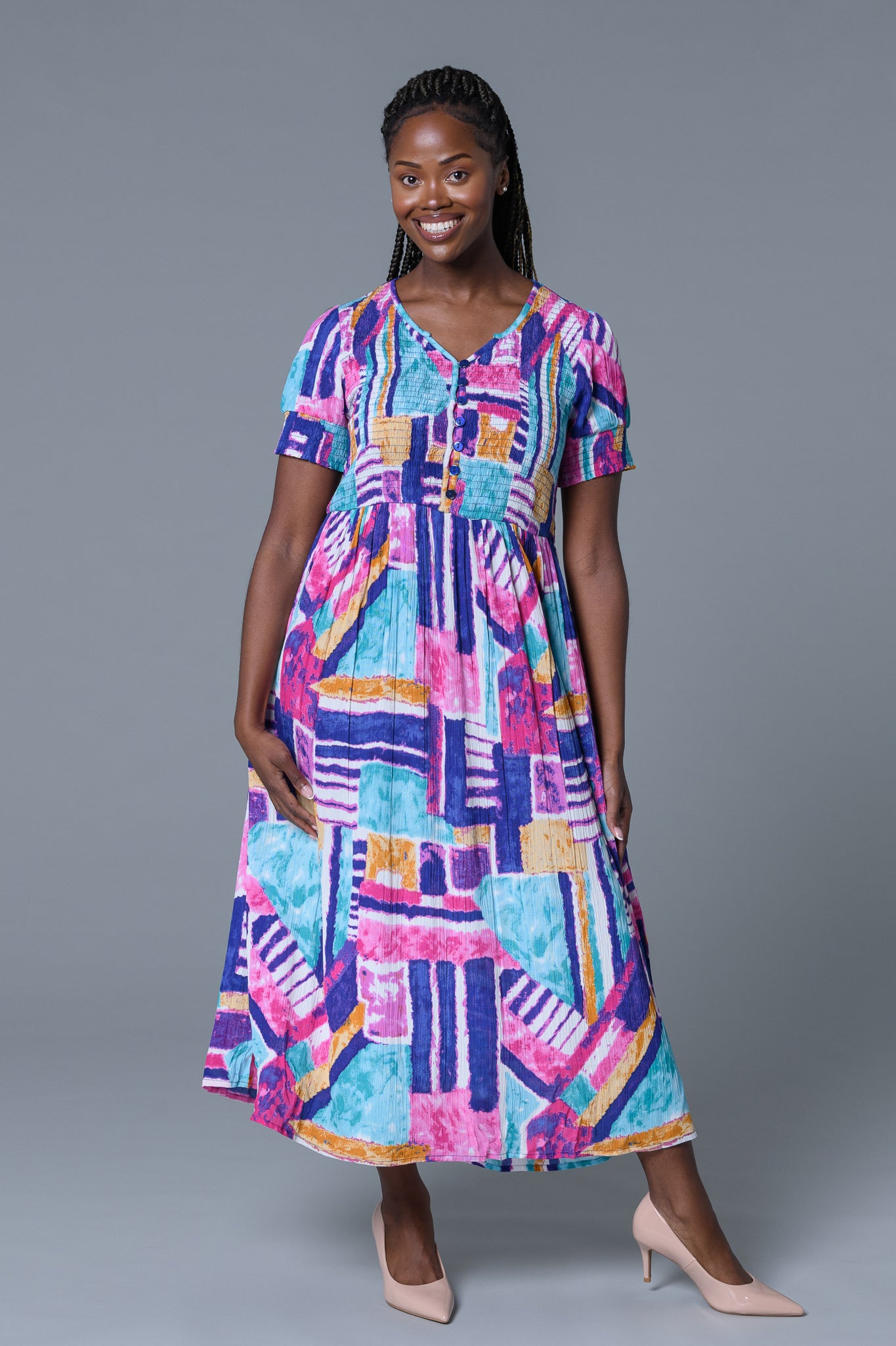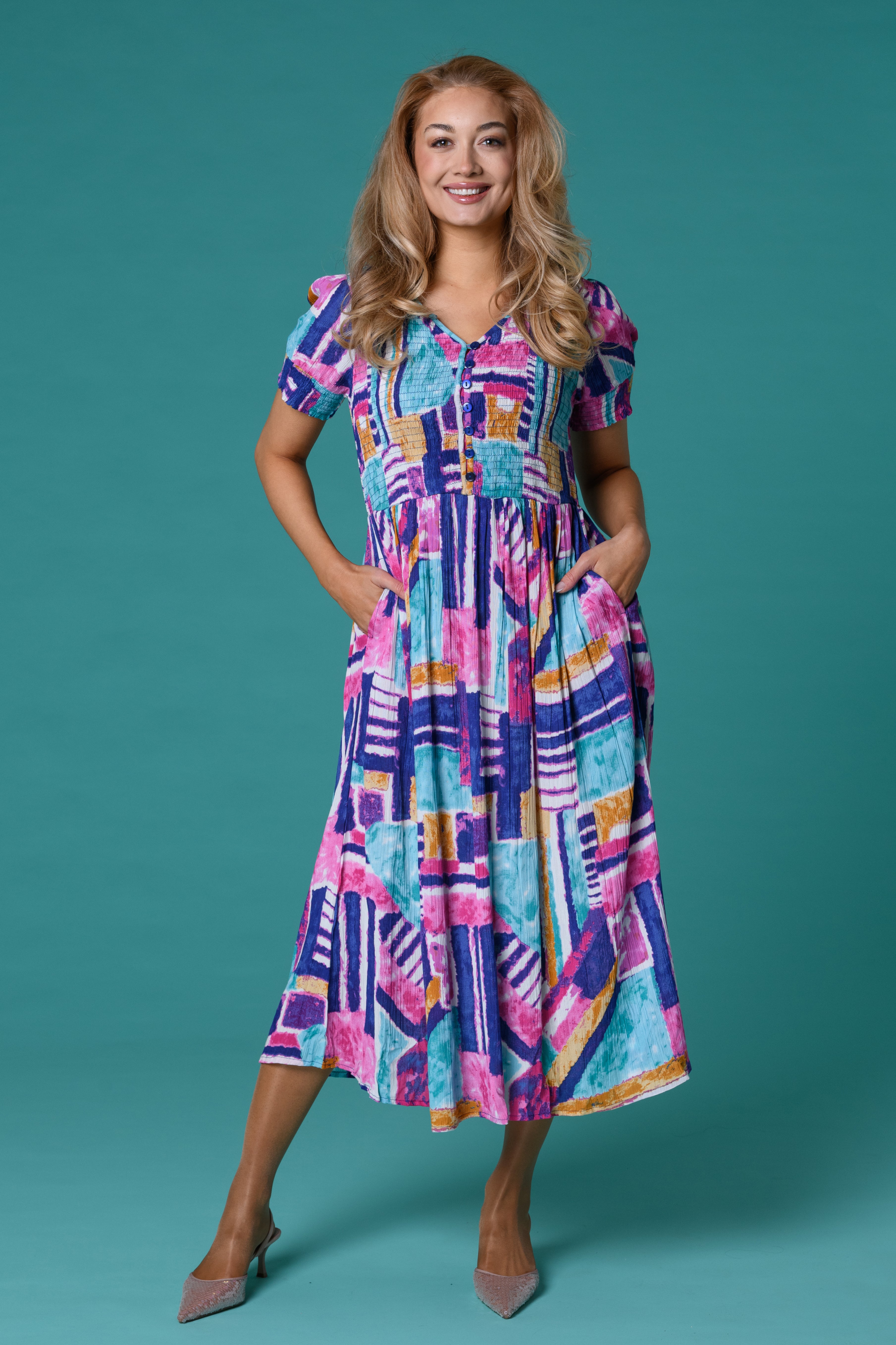Make a confident, cheerful statement in the Colourpop Geometric Dress, designed to bring colour, comfort and effortless style into your everyday wardrobe. The vibrant mix of turquoise, pink and soft accents creates a fresh, uplifting look that feels as good as it looks.