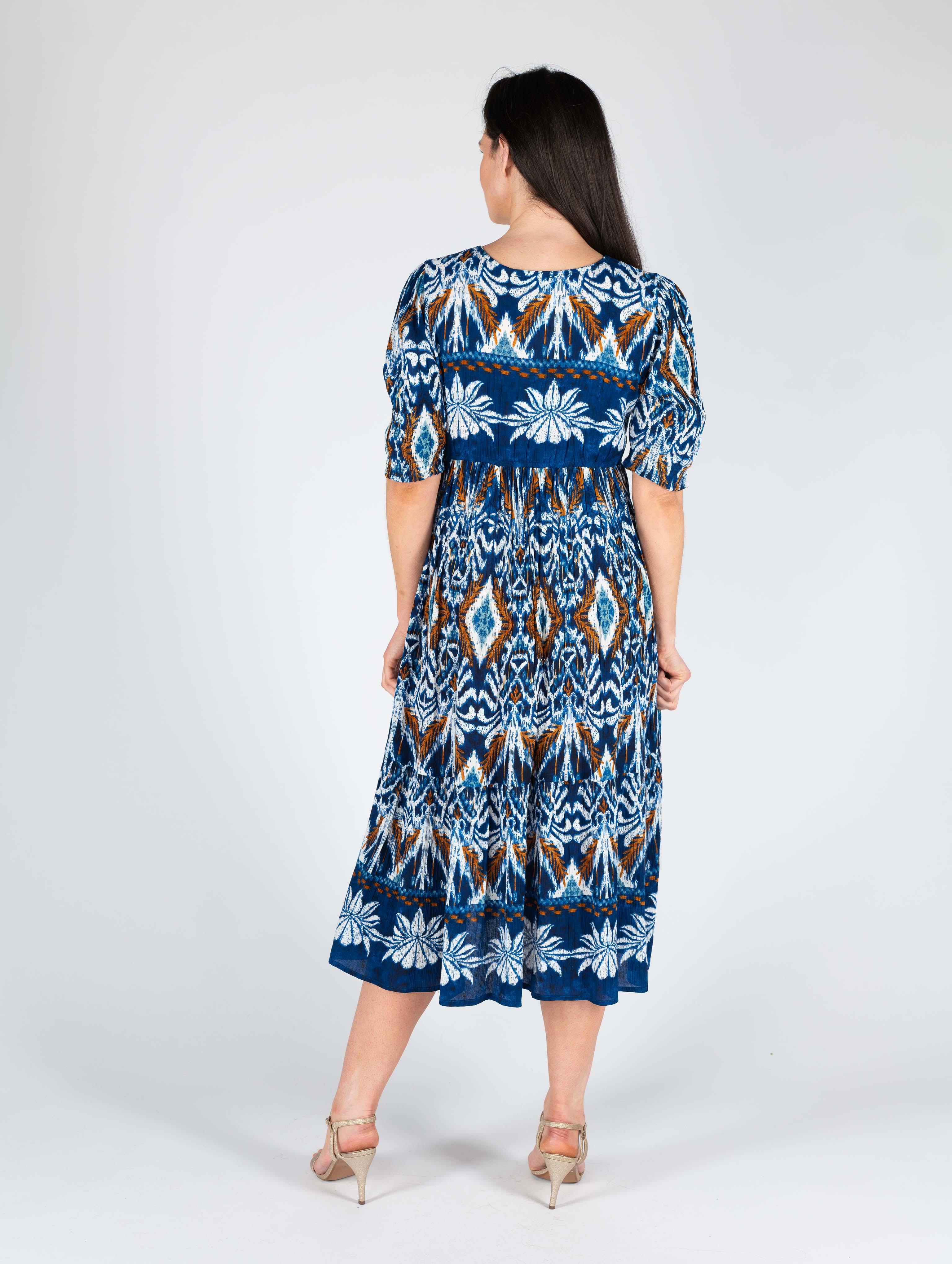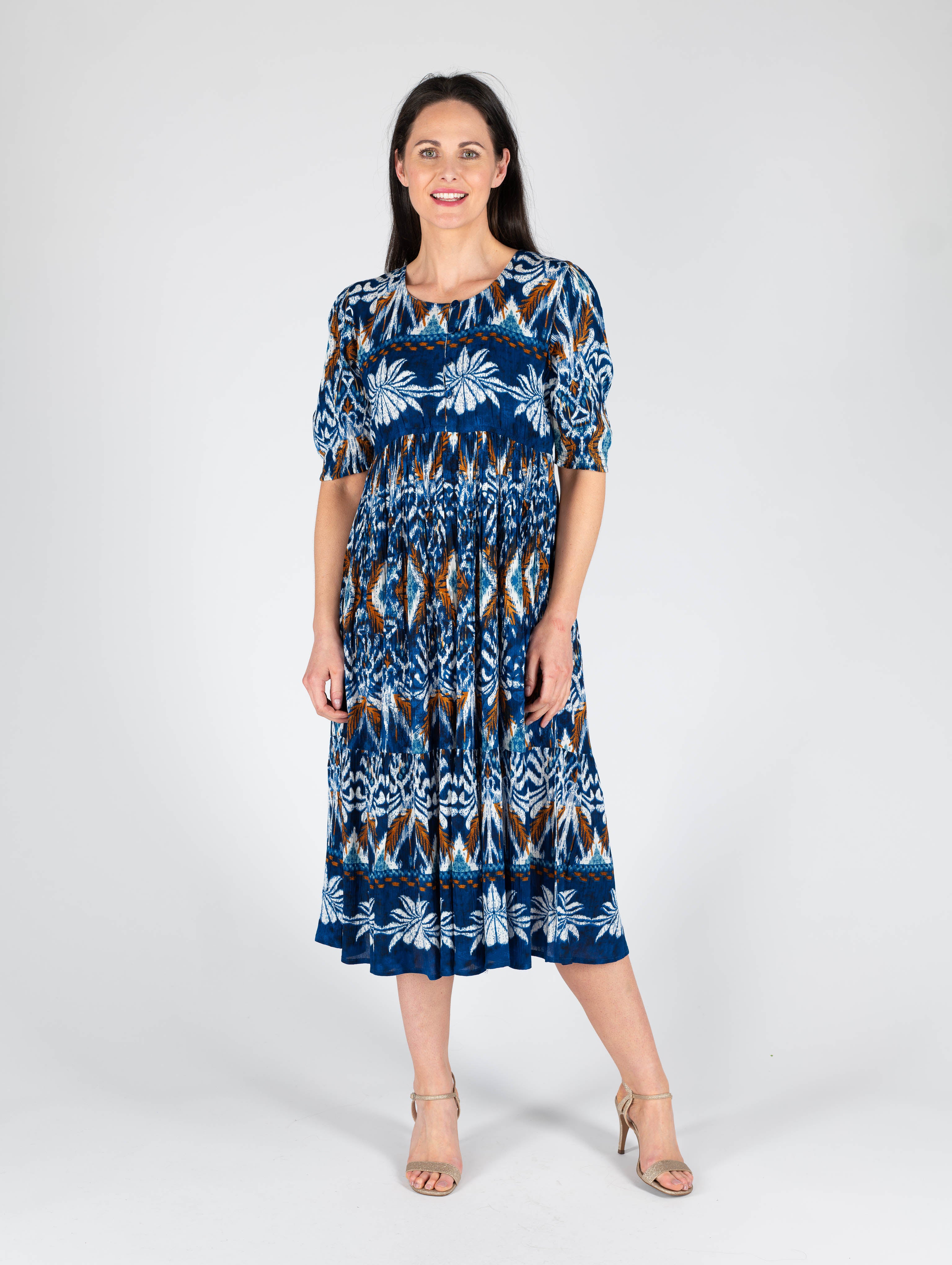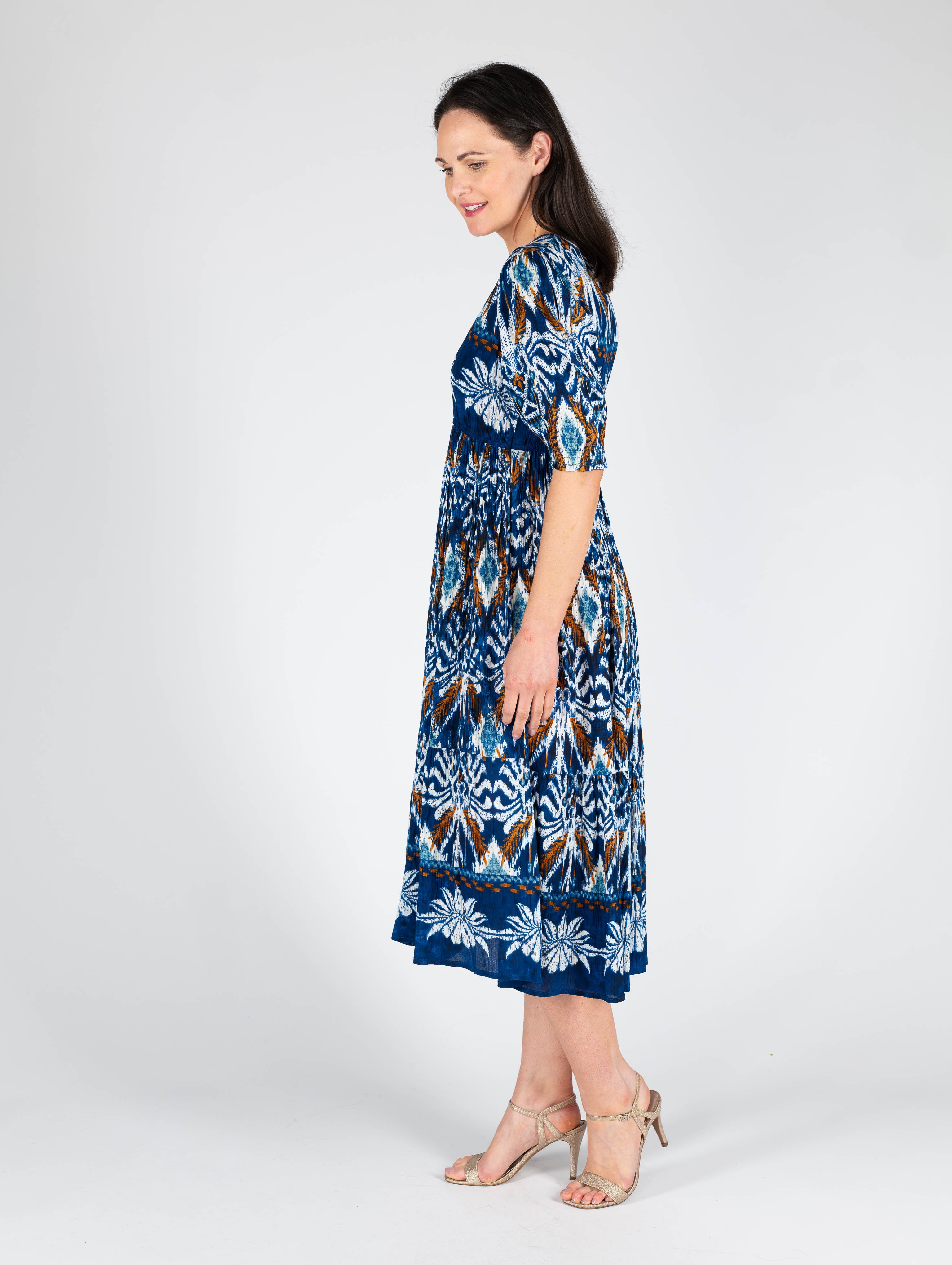 Bring a relaxed holiday feel to your wardrobe with this Tropical Print Dress in Blue Multi. The rich blue base is beautifully decorated with tropical-inspired patterns in white and warm earthy tones, creating a striking yet elegant look.
