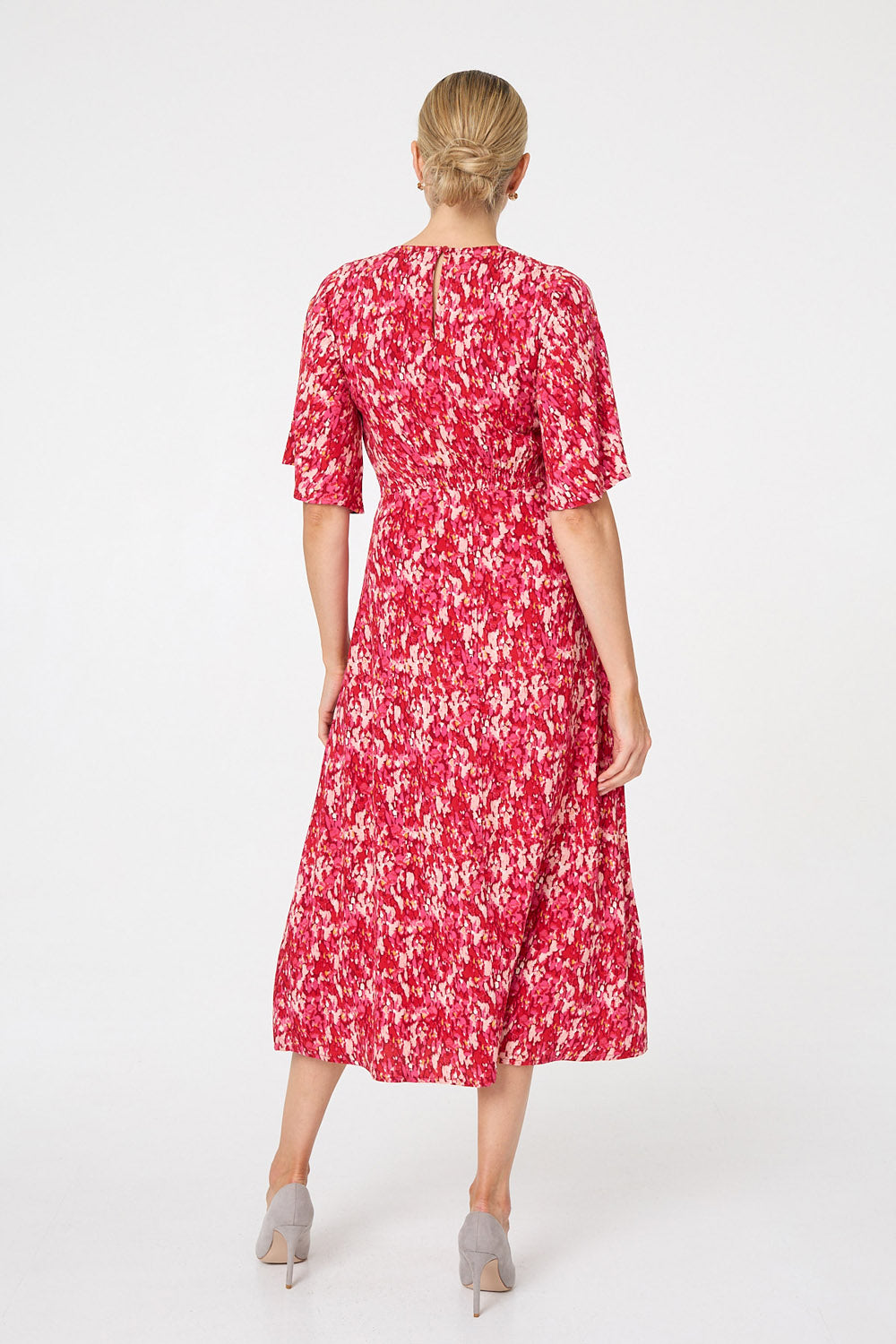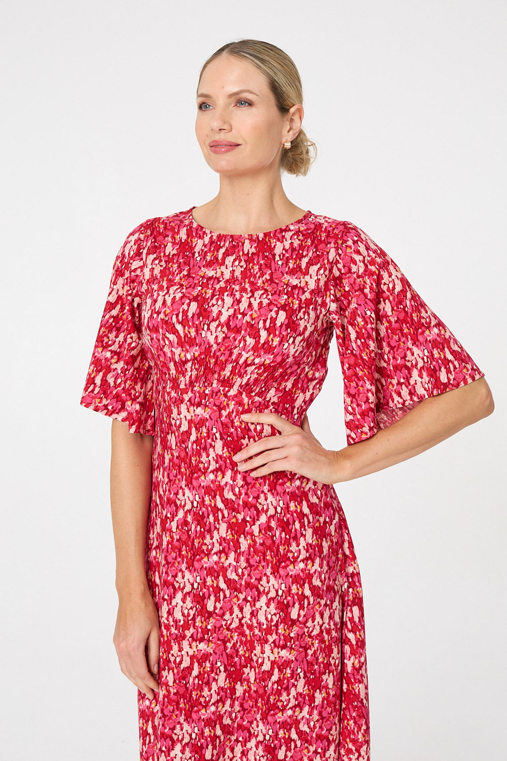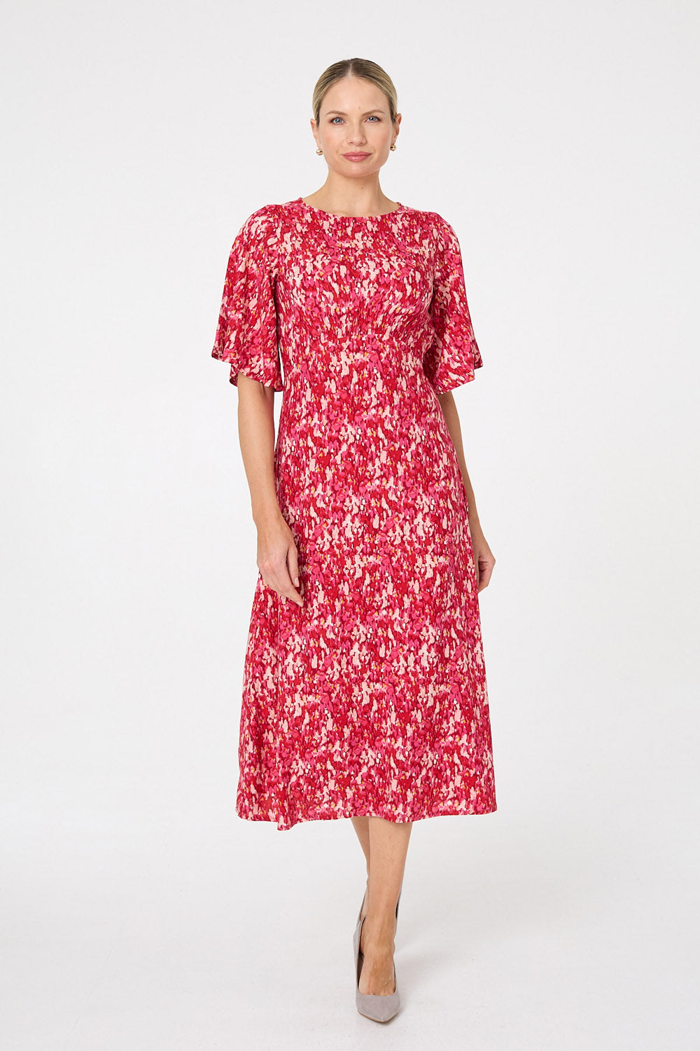 Bring vibrant colour and effortless elegance to your wardrobe with this Elastic Panel Angel Sleeve Dress in Red. The lively red print blends soft pink and coral tones, creating a fresh and feminine look that feels both modern and flattering.
