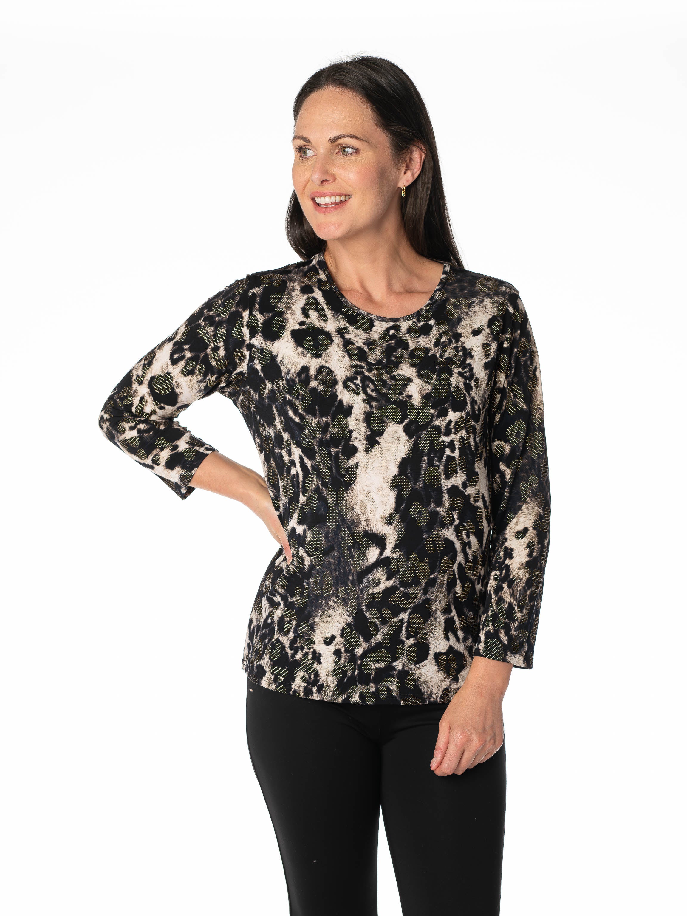 TO30396 GLITTER ANIMAL PRINT TOP WITH ROUND NECK BEIGE BLACK