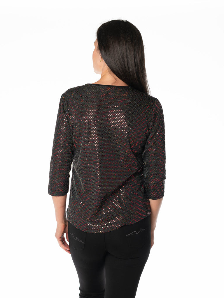 Sparkle Sequins Print Top Front Split BU Red Black