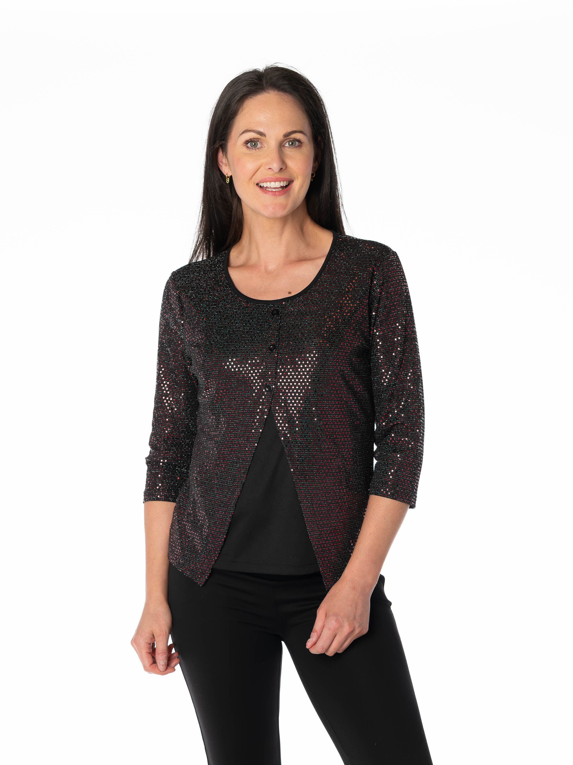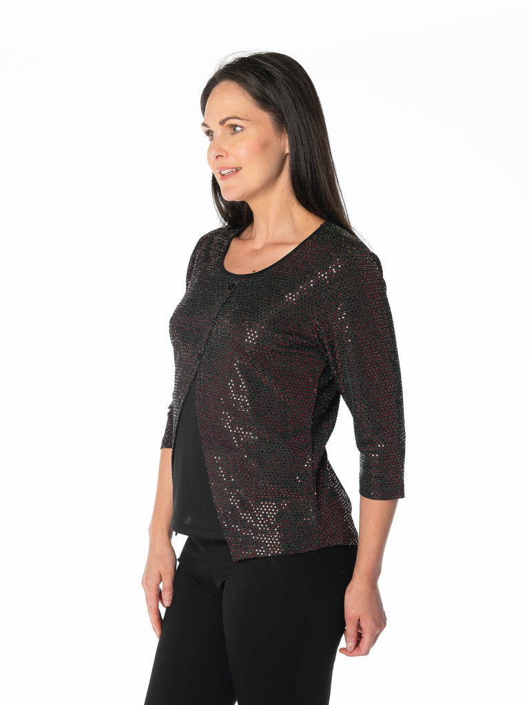 This striking sequin print top combines eye-catching sparkle with contemporary design. The front split detail adds movement and visual interest, while the bold red and black colorway makes a confident statement. Crafted with quality sequin embellishment throughout, this piece delivers glamour for special occasions or elevated everyday wear. The structured silhouette flatters the figure, and the thoughtful front split provides both style and comfort. Perfect for those seeking a standout piece that transitions seamlessly from evening events to fashion-forward daytime looks. A versatile investment that brings instant sophistication to any wardrobe.