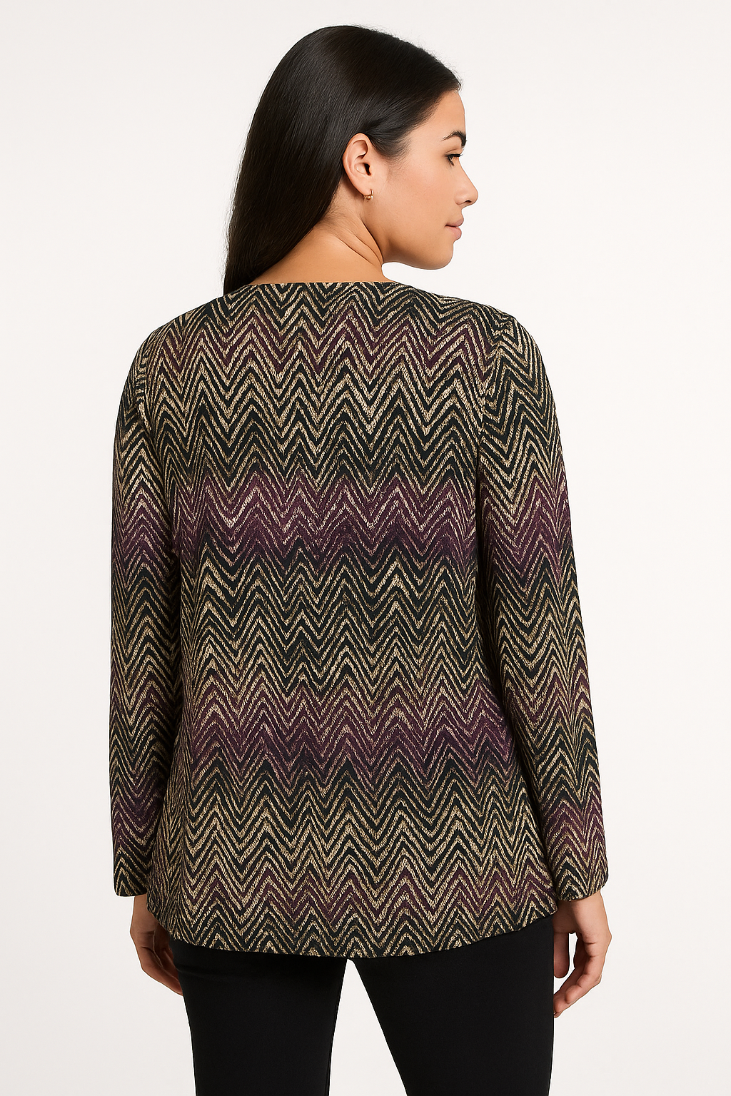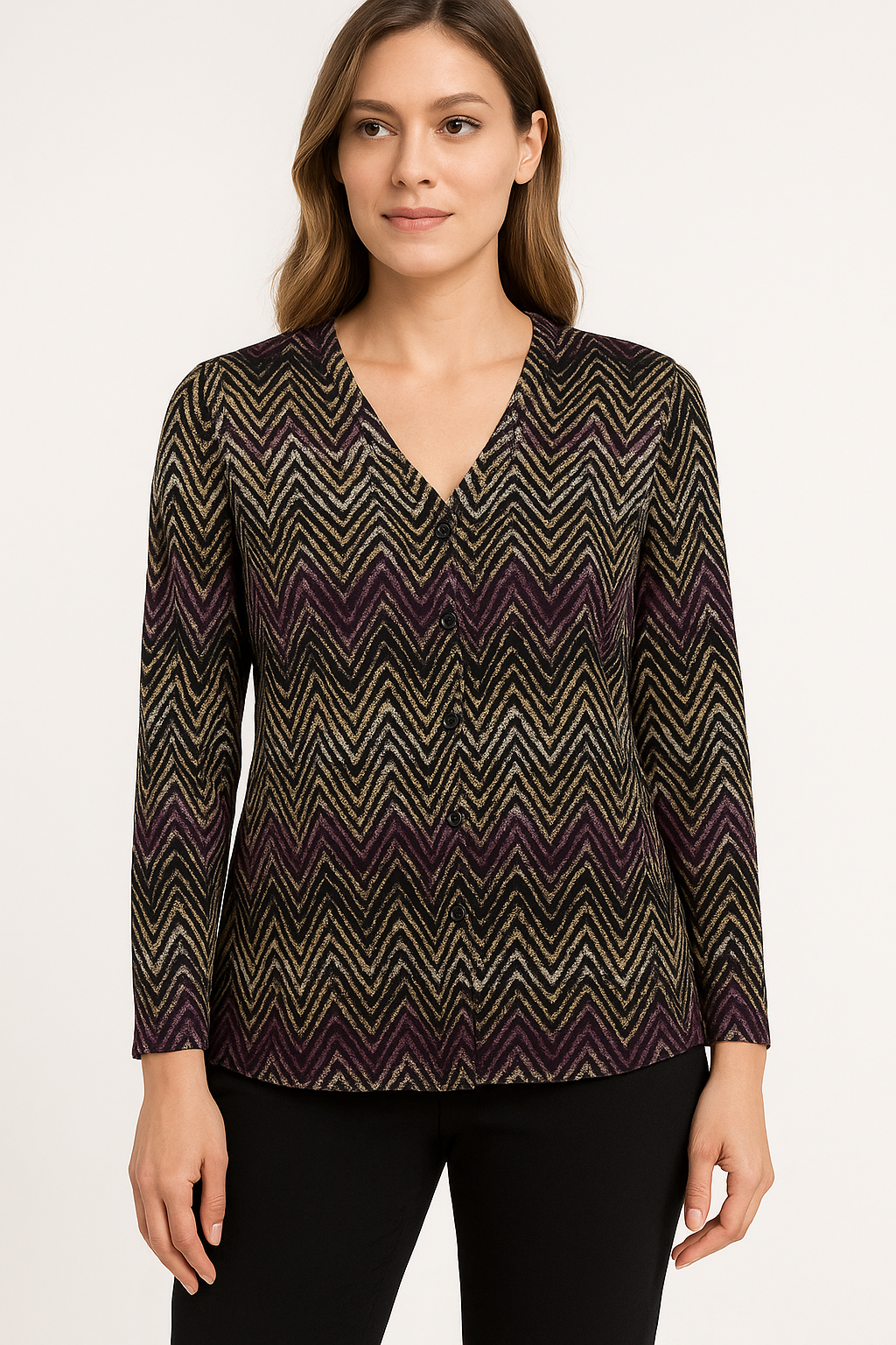 TO30430 PURPLE ZIG ZAG PRINT TOP BUTTON PLACKET PURPLE PRINT