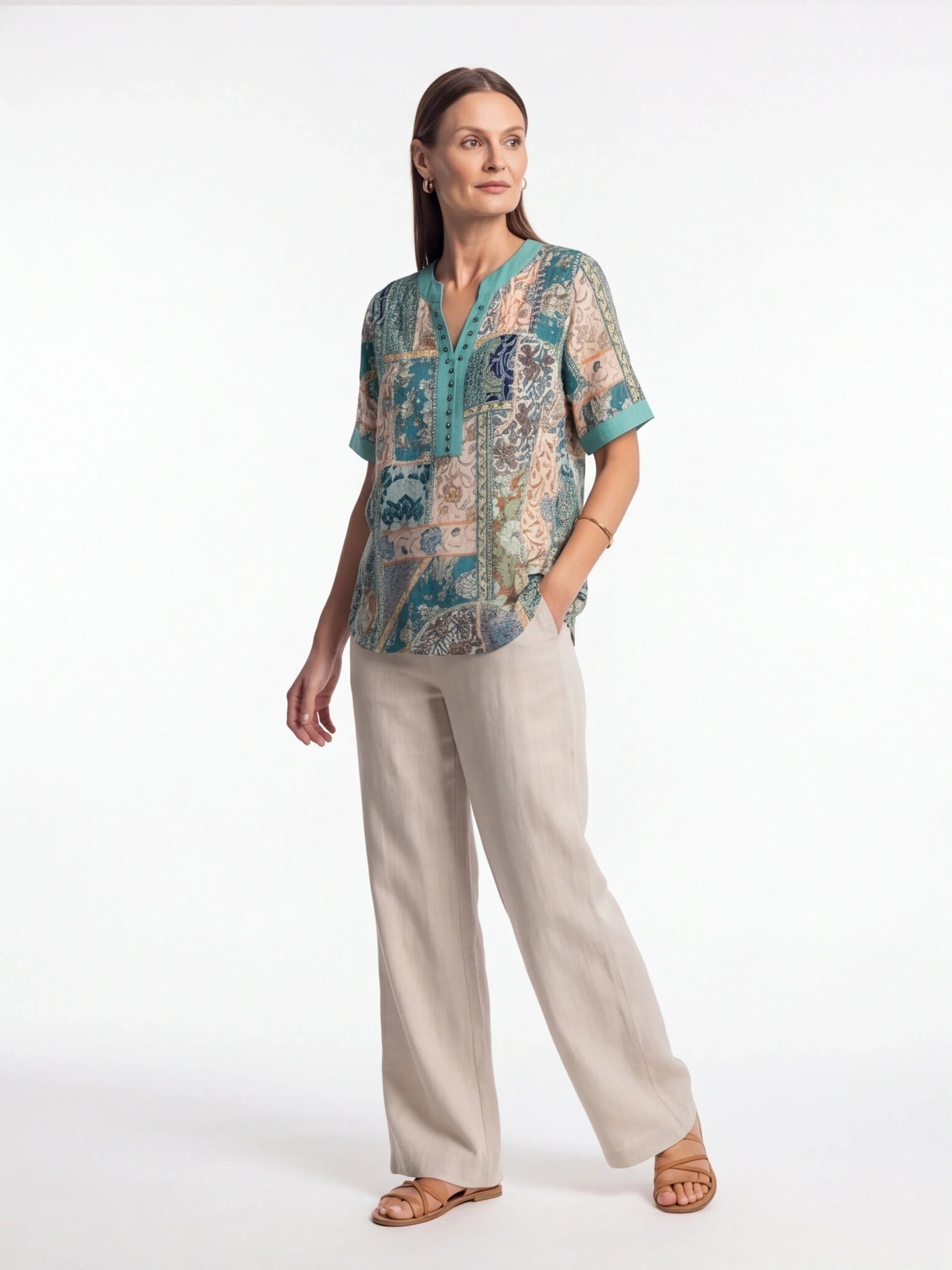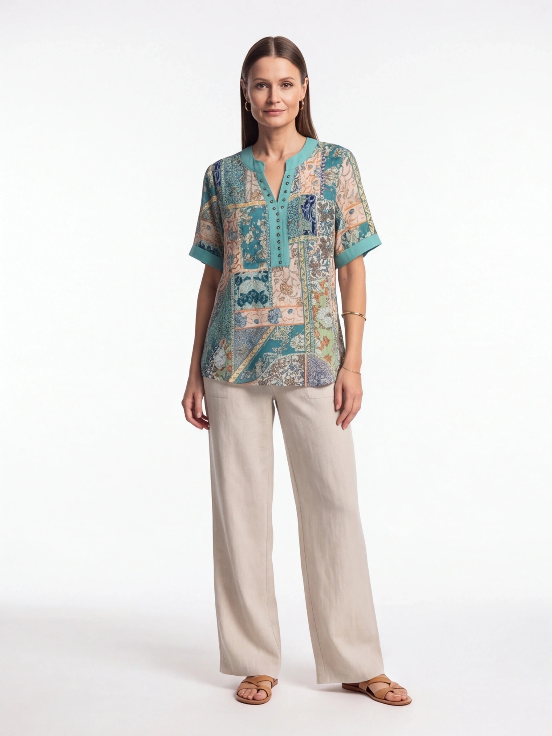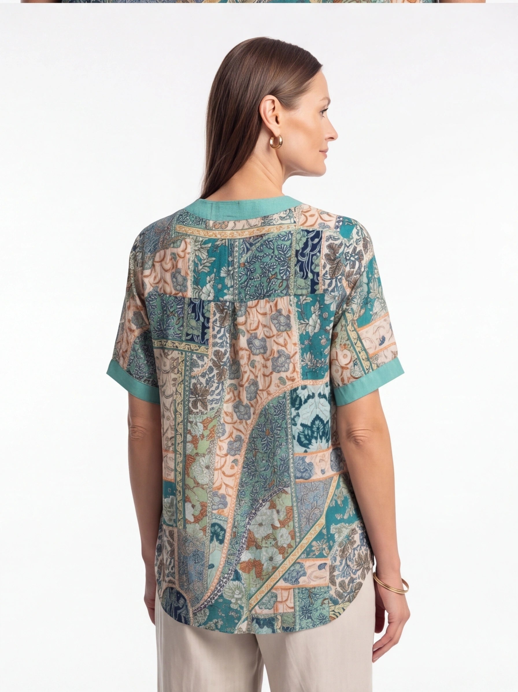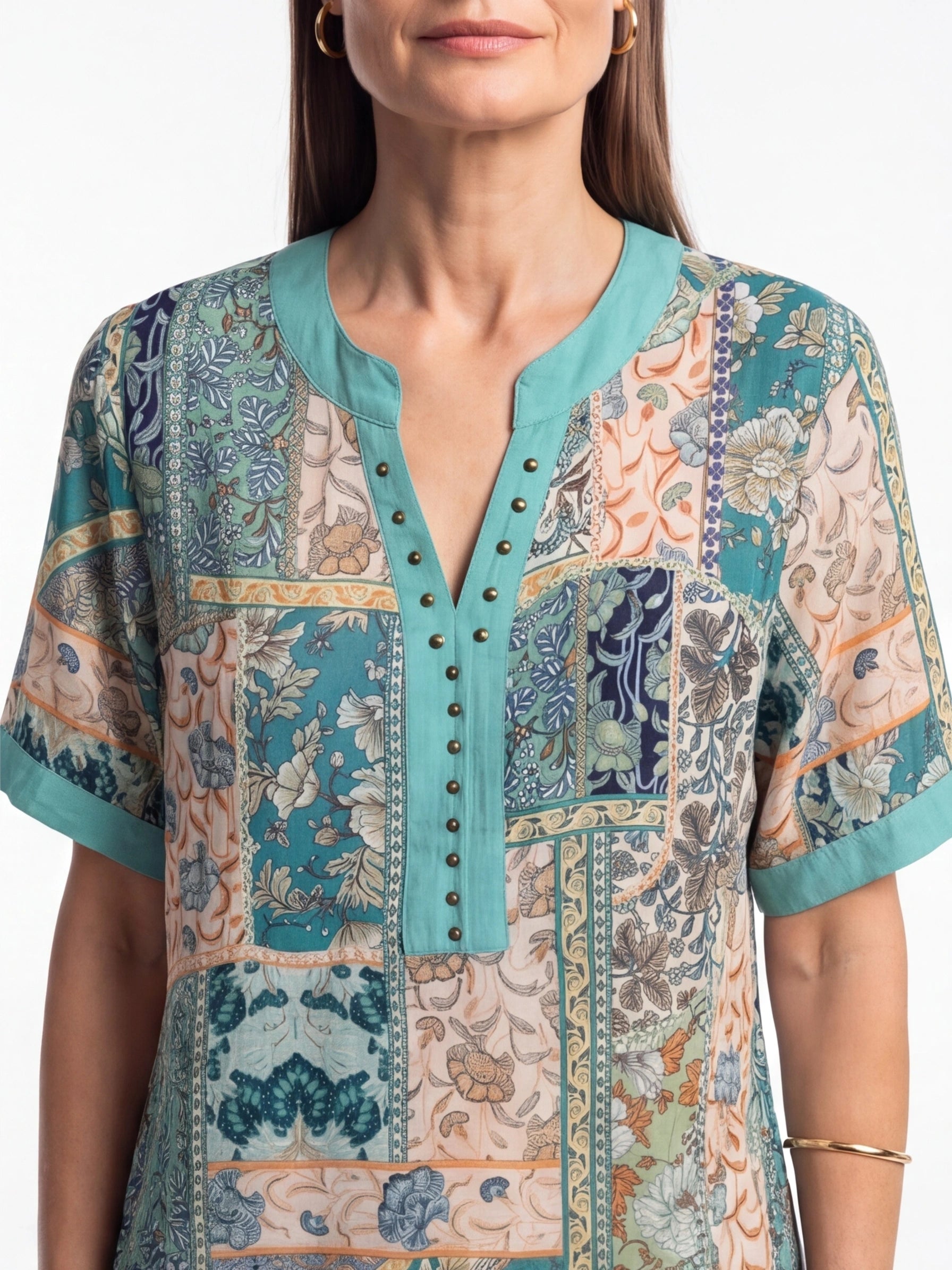 Refresh your everyday wardrobe with the Turquoise Placket Top, a beautifully detailed piece that blends soft tones with an elegant patchwork-inspired print. Designed for comfort and ease, it offers a relaxed yet polished look that works from day to evening.