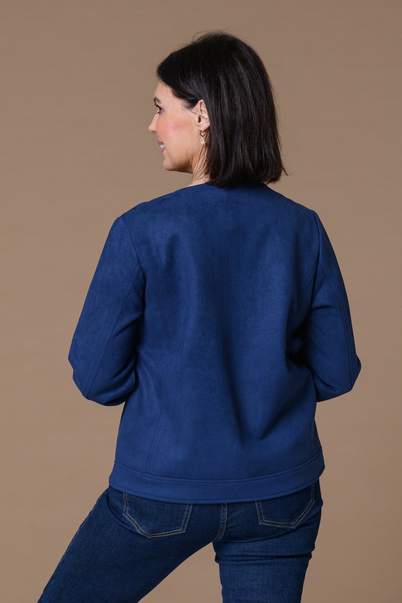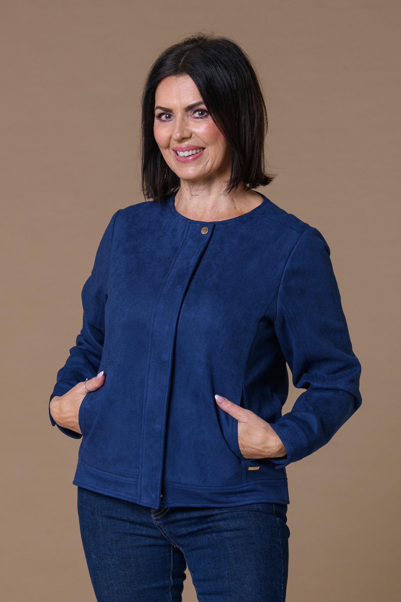 Crafted from premium suedette fabric, this navy lady jacket delivers sophisticated elegance with effortless versatility. The soft, luxurious texture provides a refined alternative to traditional suede, offering durability without the maintenance demands. Tailored for a flattering feminine silhouette, it transitions seamlessly from professional settings to casual occasions. The rich navy tone complements any wardrobe, while the structured construction ensures lasting shape and comfort. An investment piece that elevates your everyday style with understated luxury.