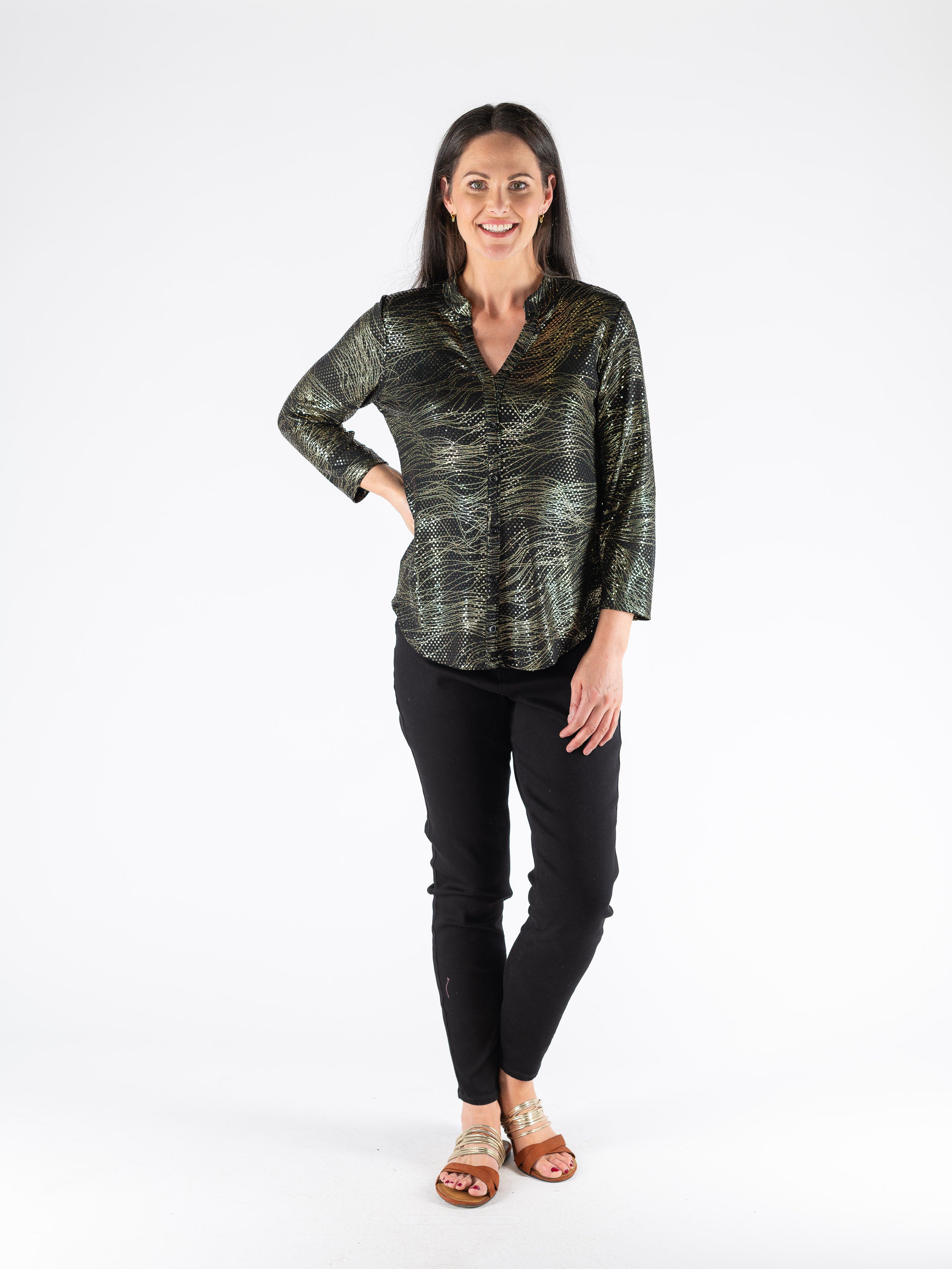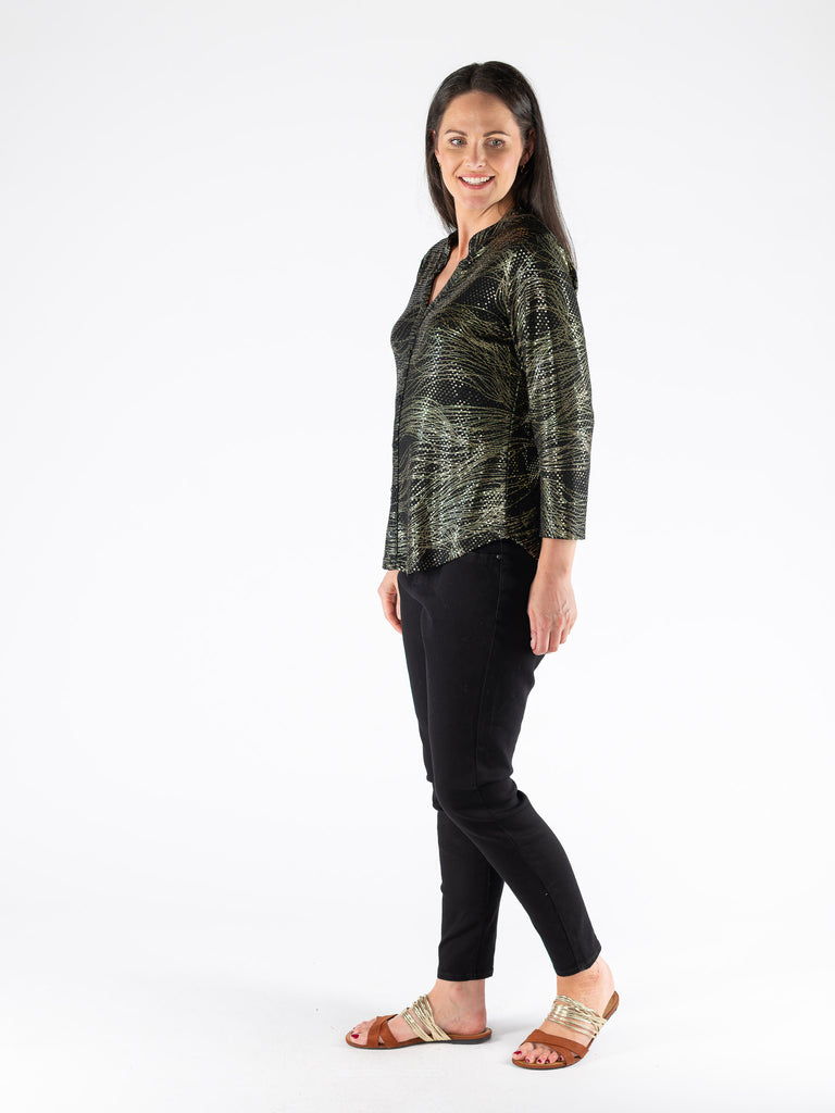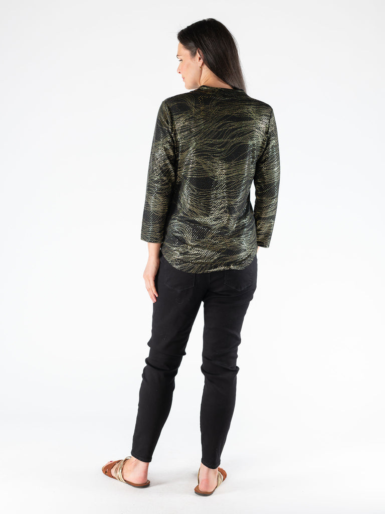 TO30413 WAVY PRINT TOP WITH BUTTON PLACKET 3/4 S BLACK GOLD
