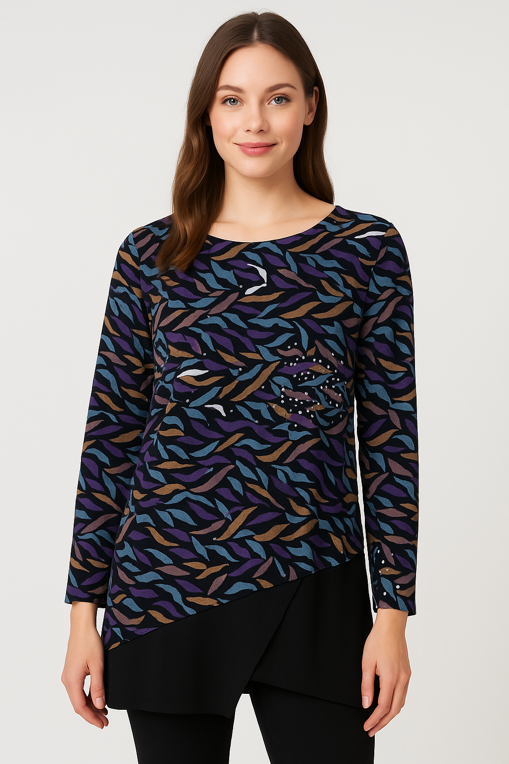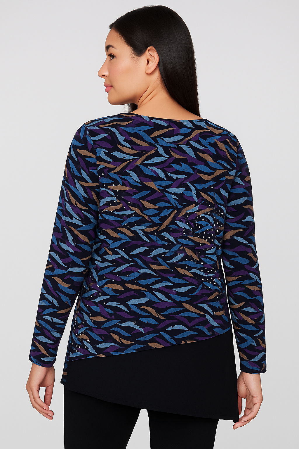 TO30426 PURPLE BLUE WAVY PRINT TOP CONTRAST PANE PURPLE BLUE