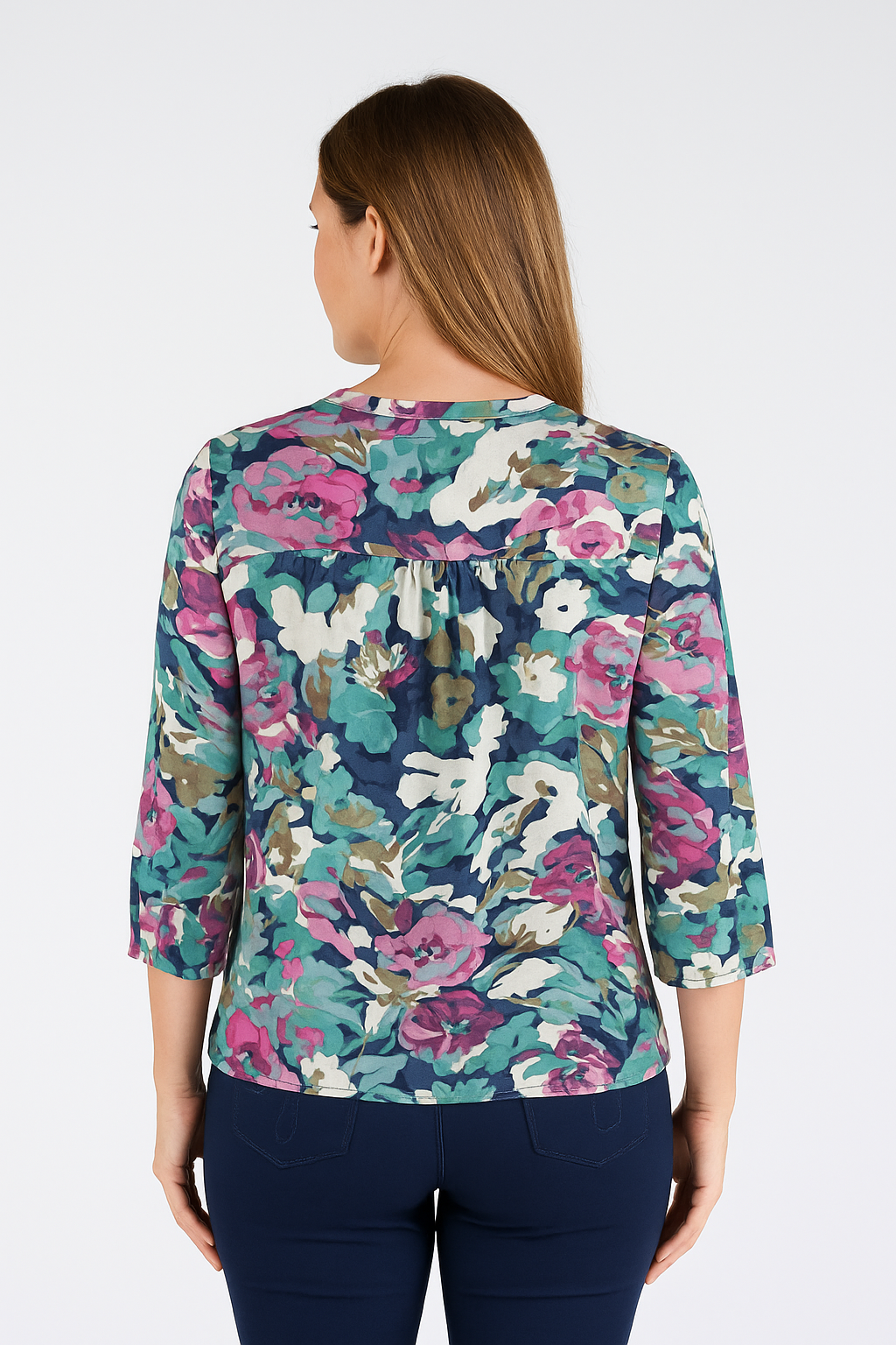 B30514 Floral Print Burnout Blouse 3/4 Sleeve Multi Print