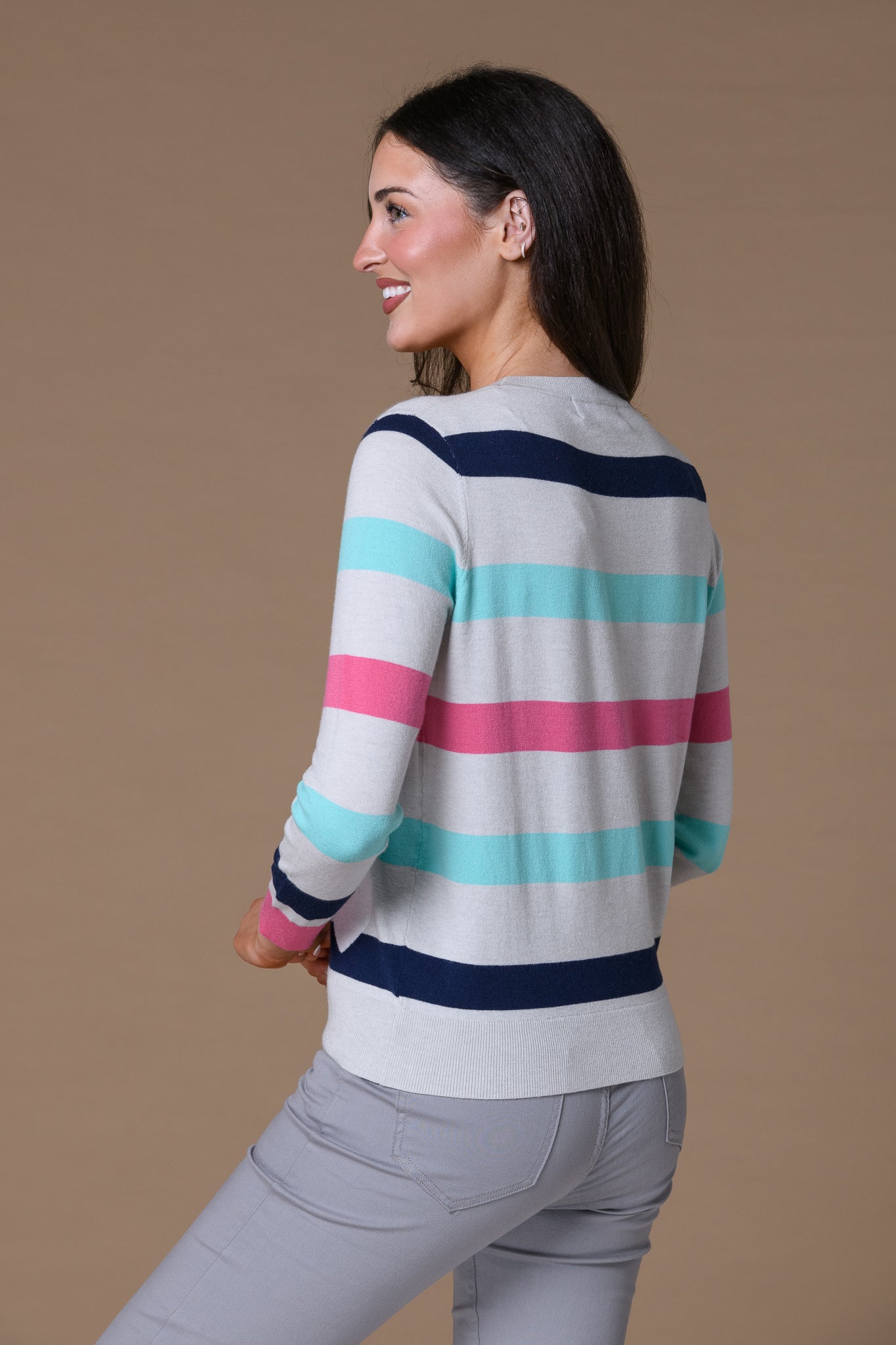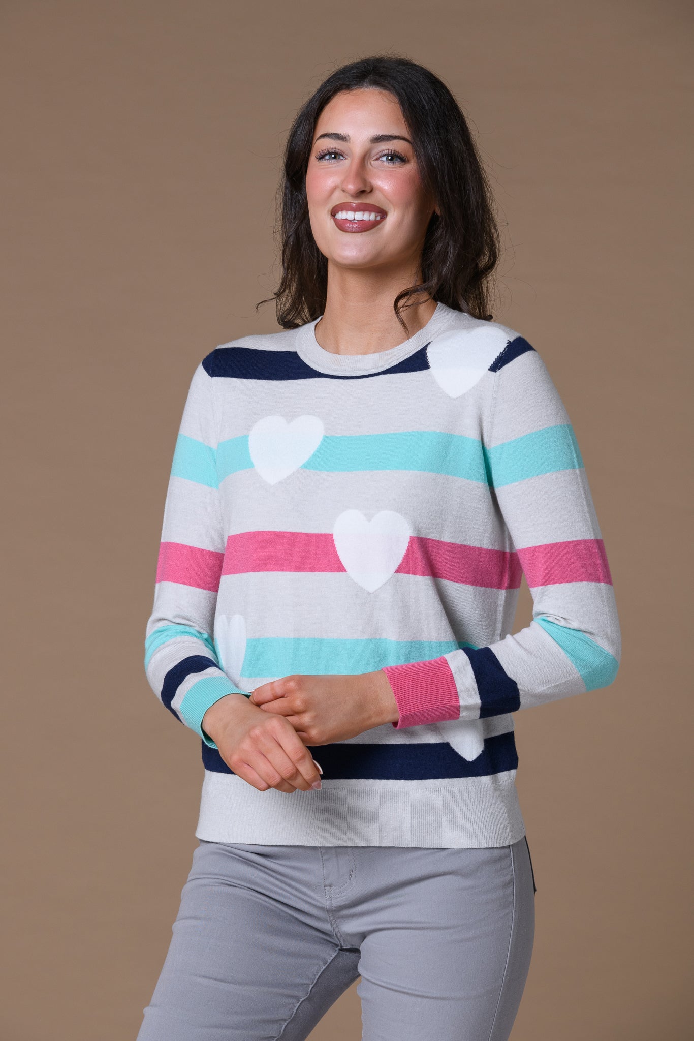 Heart + Stripe Sweater GREY A refined layering piece that combines timeless design elements with contemporary appeal. This sweater features a sophisticated palette of grey tones, accented with delicate heart motifs and subtle striping throughout. The balanced composition of pattern and solid areas creates visual interest without overwhelming the silhouette. Crafted for versatility, it transitions seamlessly from casual weekday wear to elevated weekend styling. The expert construction ensures durability and shape retention through regular wear and care.