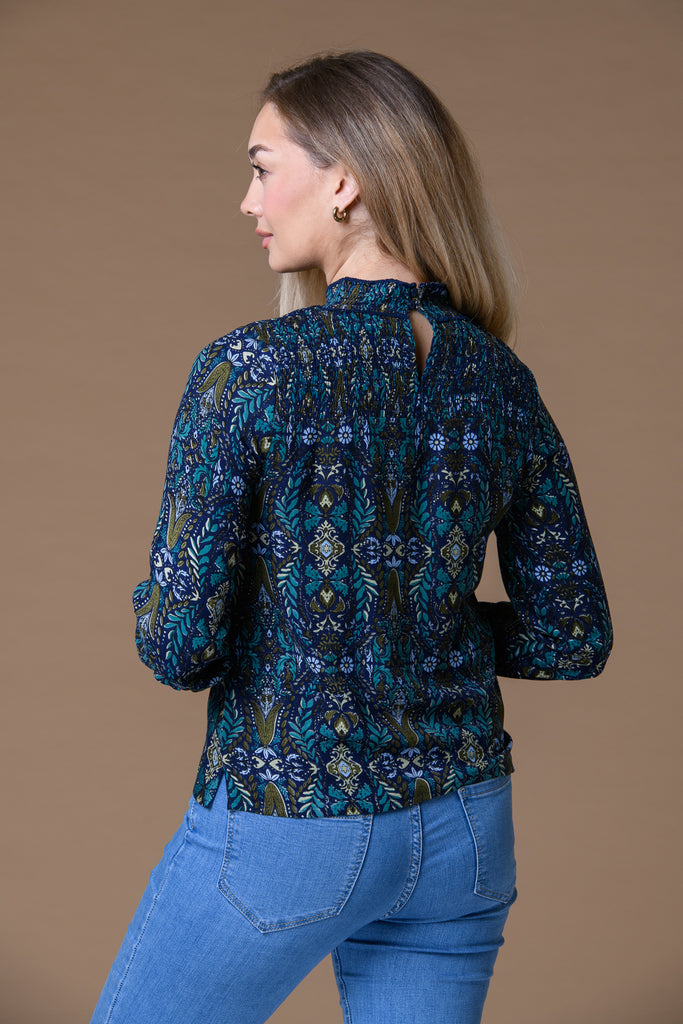 Print Shirred Neck Top BLUES