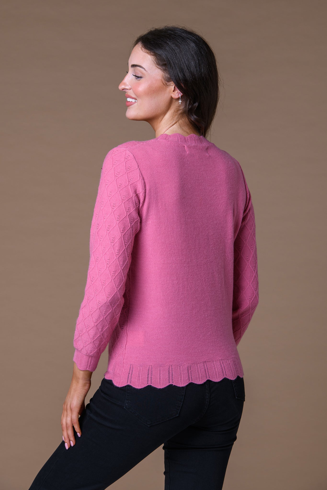 Elevate your knitwear collection with this refined scallop pointelle sweater in a soft pink hue. The delicate pointelle knit creates an airy, textured aesthetic that exudes understated elegance, while the scalloped detailing adds a feminine touch to the neckline and cuffs. Crafted for comfort and style, this versatile piece transitions effortlessly from casual daywear to evening occasions. Perfect for layering or wearing solo, it's a timeless addition to any wardrobe.