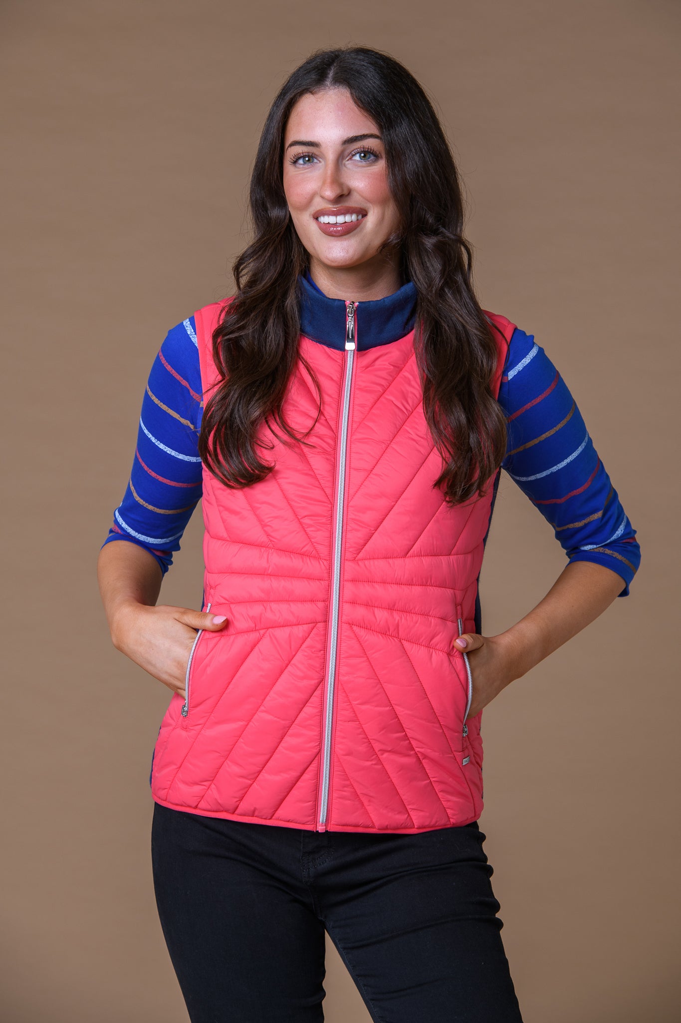 Elevate your layering game with this striking Contrast Detail Gilet in Pink and Navy. Expertly crafted with thoughtful color blocking, this versatile piece transitions seamlessly from casual weekends to polished workwear. The contrasting panels create visual interest while the gilet silhouette offers lightweight warmth without bulk. Perfect for layering over shirts or sweaters, it delivers both style and functionality. The bold pink and navy combination makes a confident statement, while the structured fit ensures a flattering profile. An essential addition to any modern wardrobe seeking contemporary edge with practical appeal.