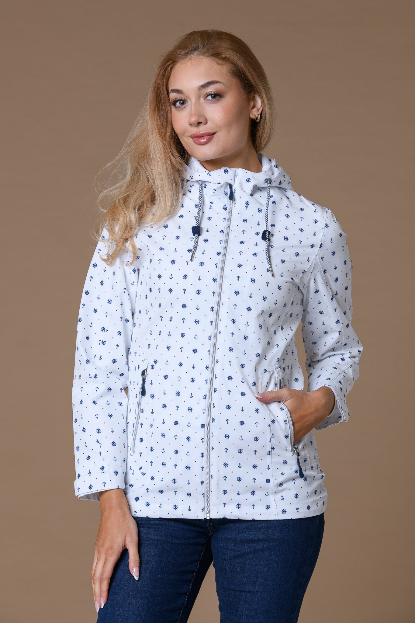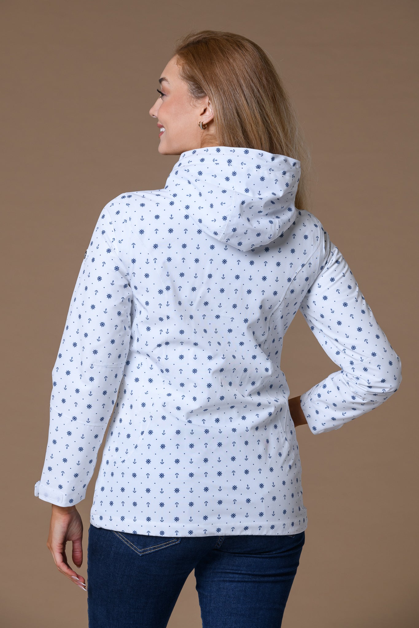 - Design: White jacket with an all-over navy nautical print (anchors, wheels, and sailing motifs) for a fresh, seaside-inspired look