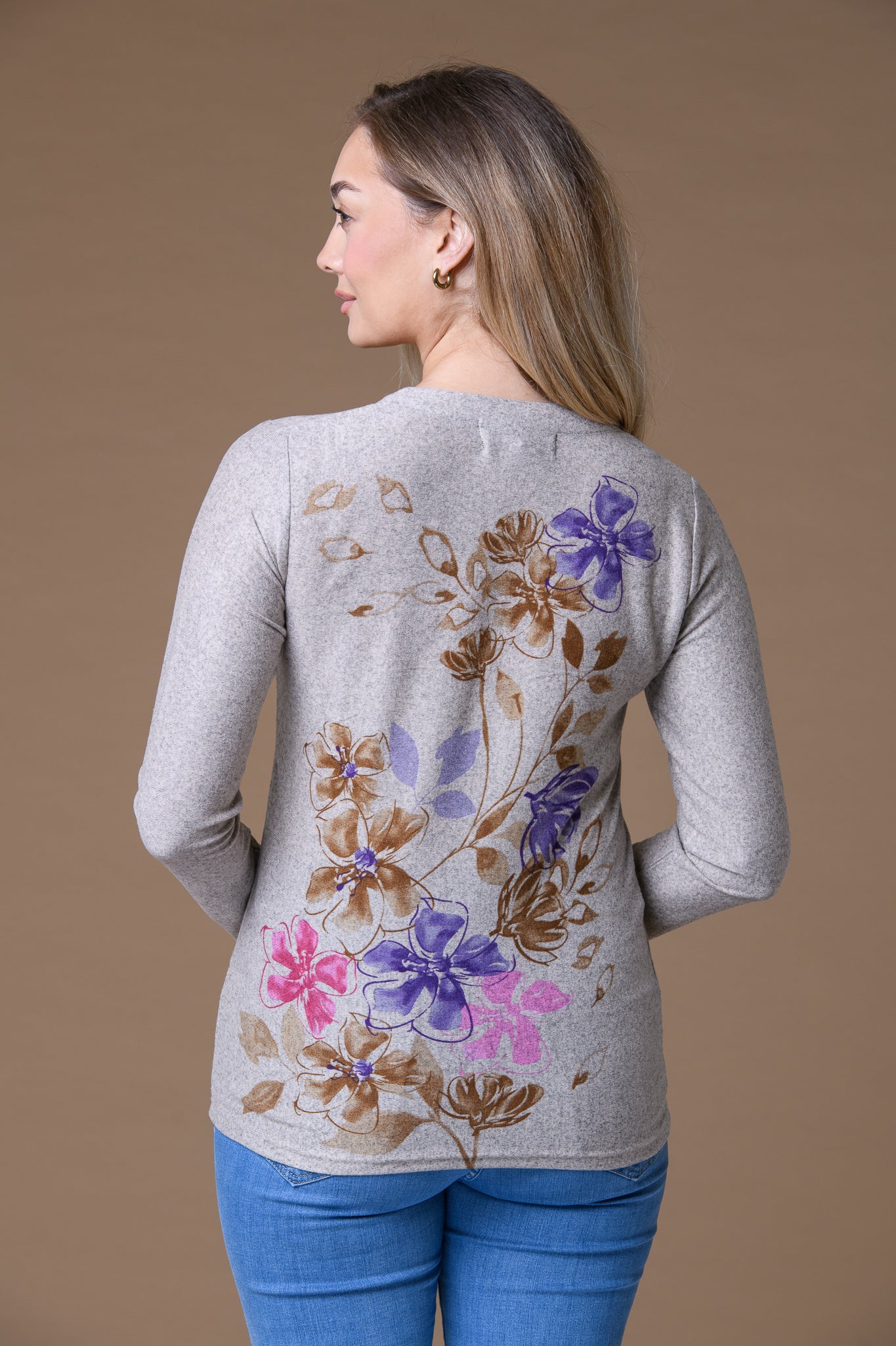 Add a touch of comfort and style to your wardrobe with this brushed top in beige marl. Designed with a striking placement print and a soft, cosy texture, it’s perfect for relaxed yet polished everyday looks.