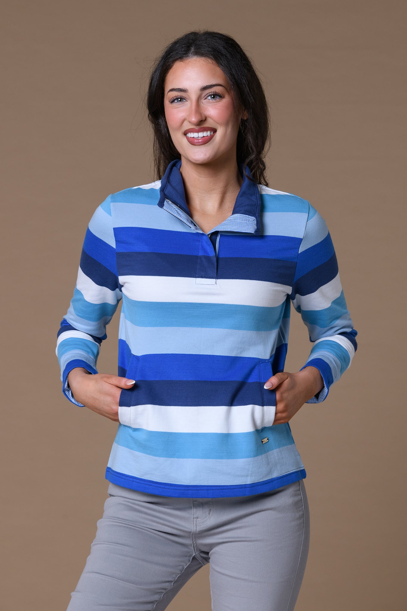 Designed for relaxed comfort, this sweatshirt features a flattering fit with a practical front pocket and a stylish zip neckline with contrast collar detail. Perfect for casual days, it offers warmth without feeling heavy.