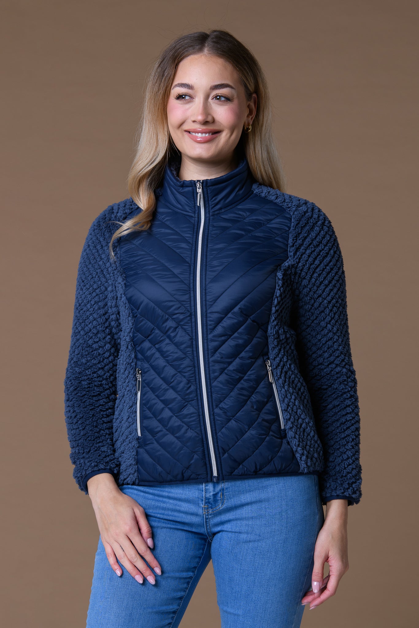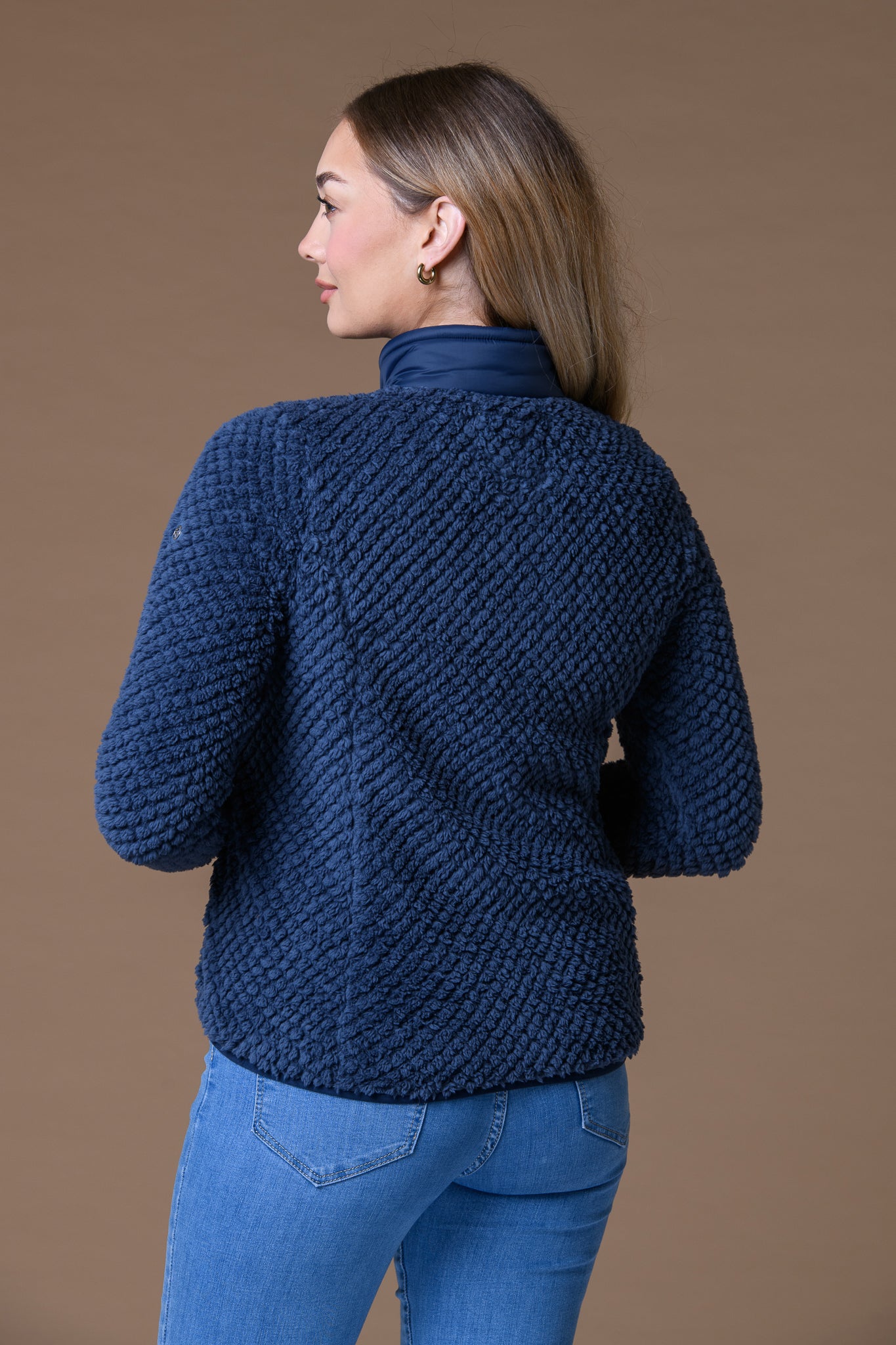 Elevate your layering game with this sophisticated Diagonal Quilt + Velour Jacket in navy. Expertly crafted to combine contemporary design with functional warmth, this piece features a striking diagonal quilted pattern that adds visual depth and texture. The luxurious velour exterior delivers a refined finish, while the quilted construction provides superior insulation without excess bulk. Perfect for transitional seasons or layering over lighter pieces, this navy jacket transitions seamlessly from casual weekends to polished occasions. A versatile wardrobe essential that balances style with practical comfort.