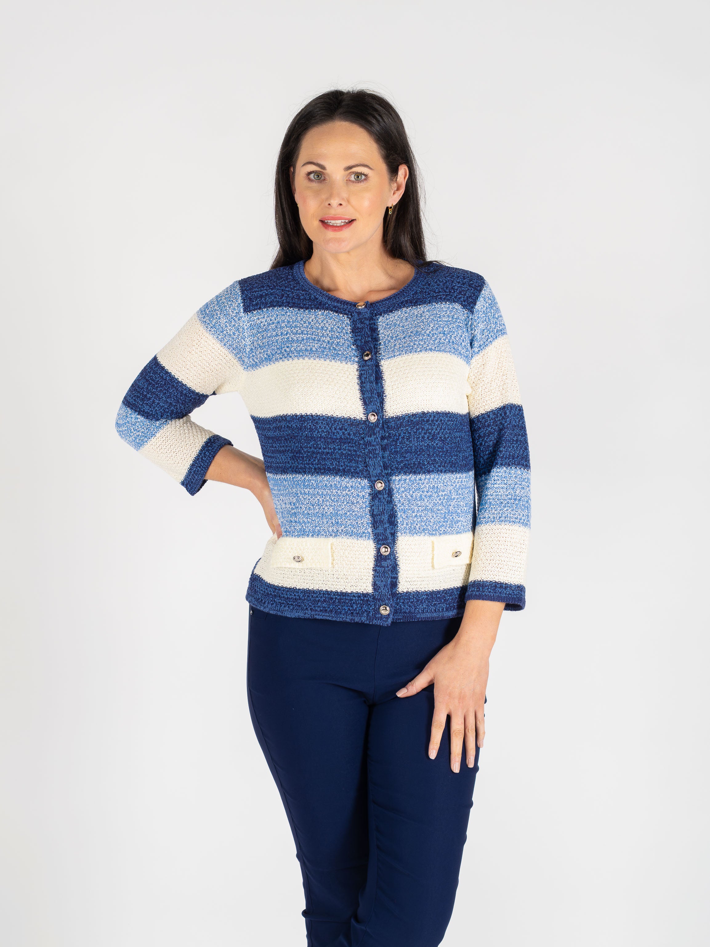 Elevate your layering game with this sophisticated blue multi-stripe cardigan, expertly crafted with thoughtful design details. The classic 3/4 sleeve length offers versatile styling options for any season, while functional pocket detailing adds both practicality and contemporary appeal. The refined stripe pattern in complementary blue tones creates visual interest without overwhelming your ensemble, making it an essential piece for building a cohesive wardrobe. Perfect for transitional dressing, this cardigan pairs effortlessly with basics or dresses, delivering understated elegance with every wear.