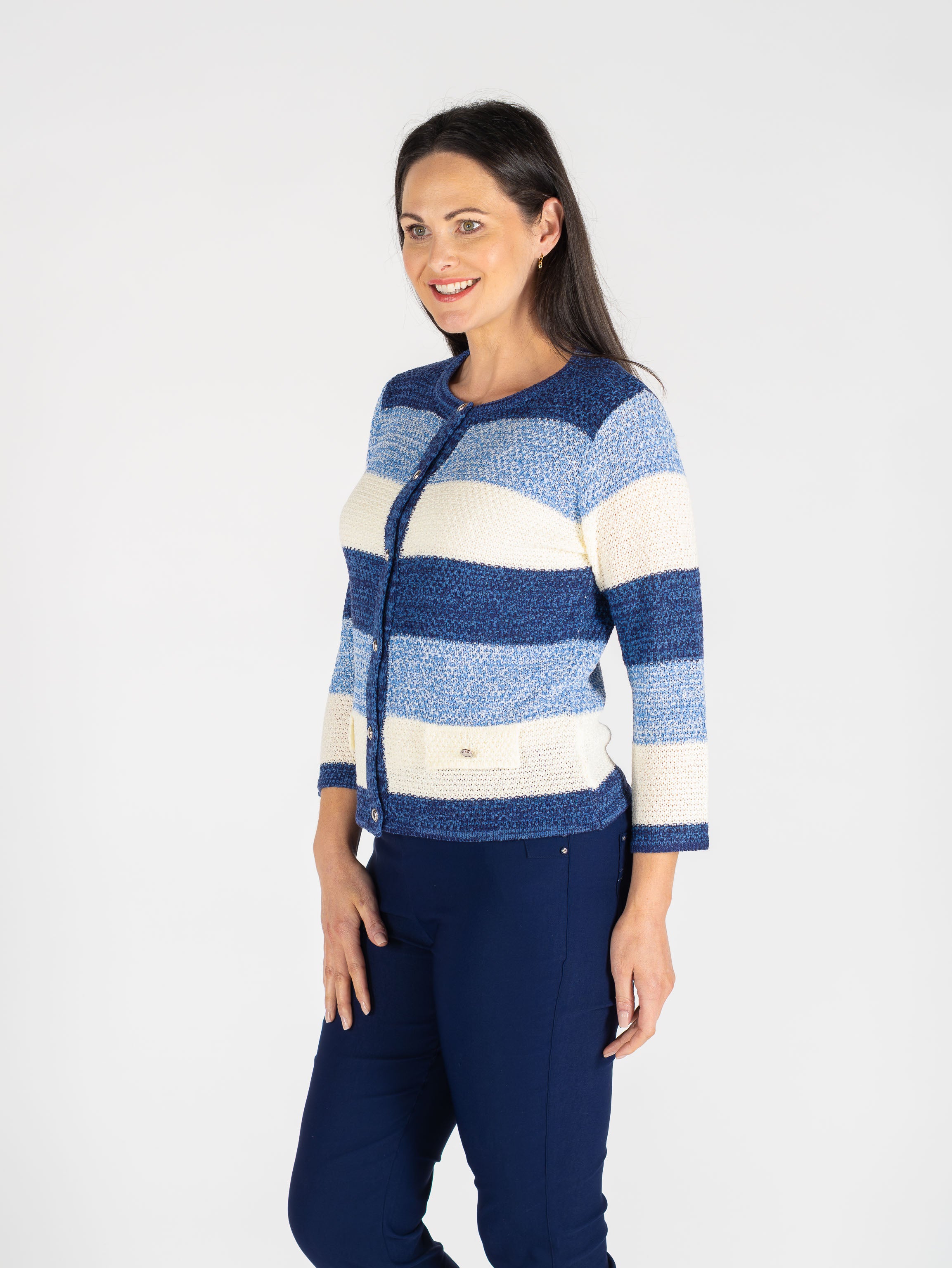 Blue Multi Stripe Cardigan Pocket Detail 3/4 CA30652 Blue Multi