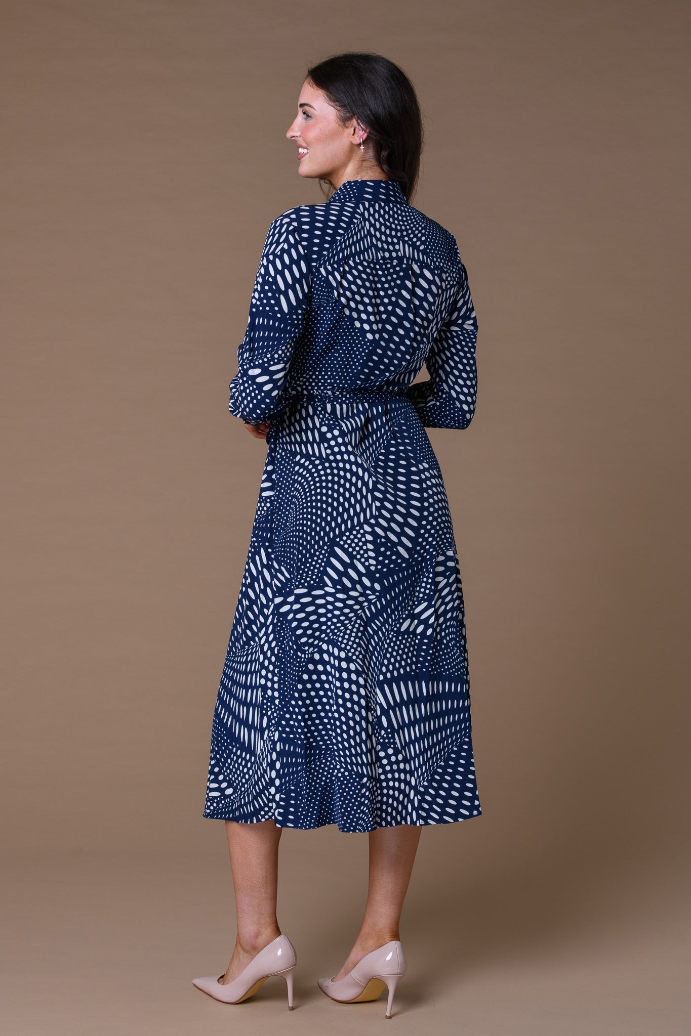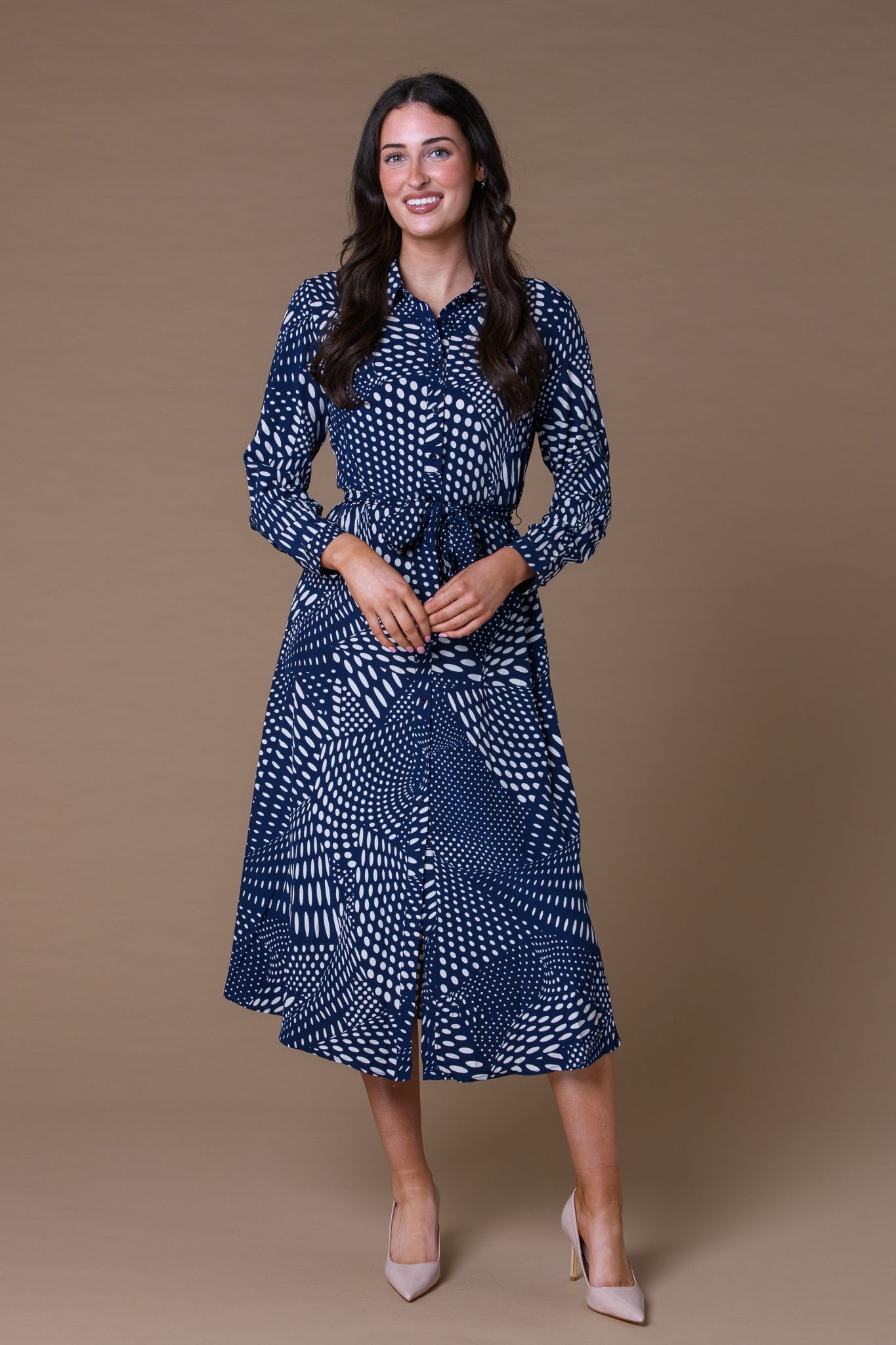 Elevate your wardrobe with this sophisticated Spotted Maxi Shirt Dress in navy. Designed with timeless appeal, the classic polka dot pattern adds visual interest while maintaining an understated elegance. The maxi silhouette offers versatility—wear it as a statement dress for casual outings or layer it for professional settings. The shirt dress construction provides structure and comfort, making it suitable for all-day wear. Navy's neutral sophistication pairs effortlessly with accessories, allowing you to transition seamlessly from day to evening. A refined choice for those seeking quality basics with distinctive character.