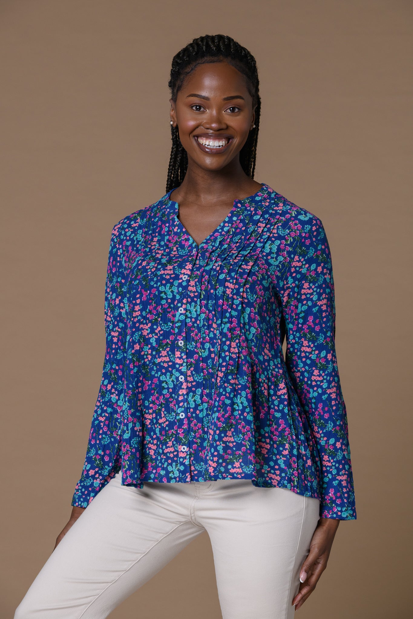 A beautifully lightweight blouse with a delicate ditsy floral print, this Ditsy Pleat Crinkle Top brings effortless elegance to your everyday wardrobe. Softly pleated through the front, it creates a flattering shape while remaining easy and comfortable to wear.