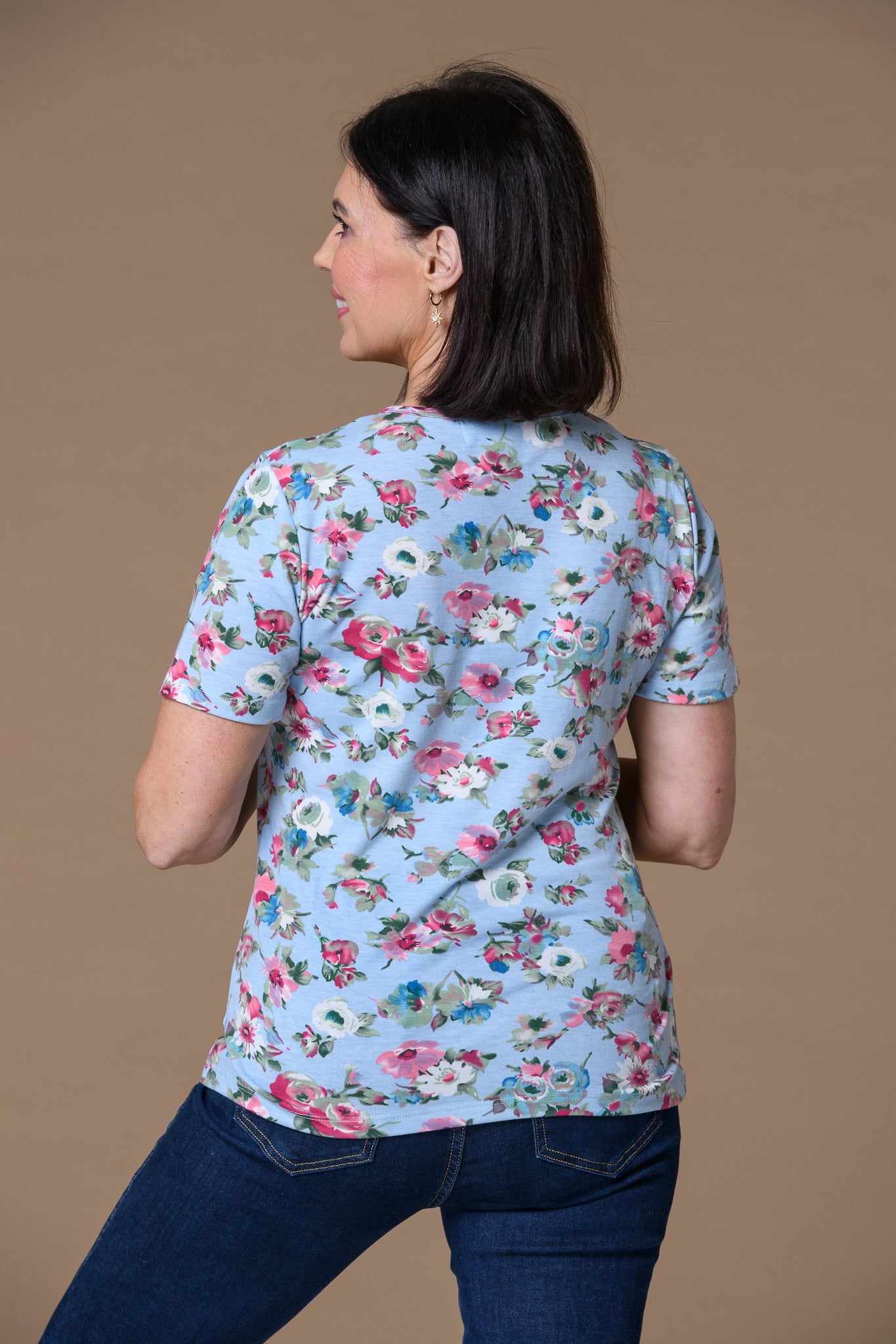 Soft, feminine and effortlessly wearable, the Pastel Flowers V Neck Top is a lovely everyday piece that brings a gentle touch of colour to your wardrobe. The delicate floral print on a soft blue base feels fresh, calm and easy to style.