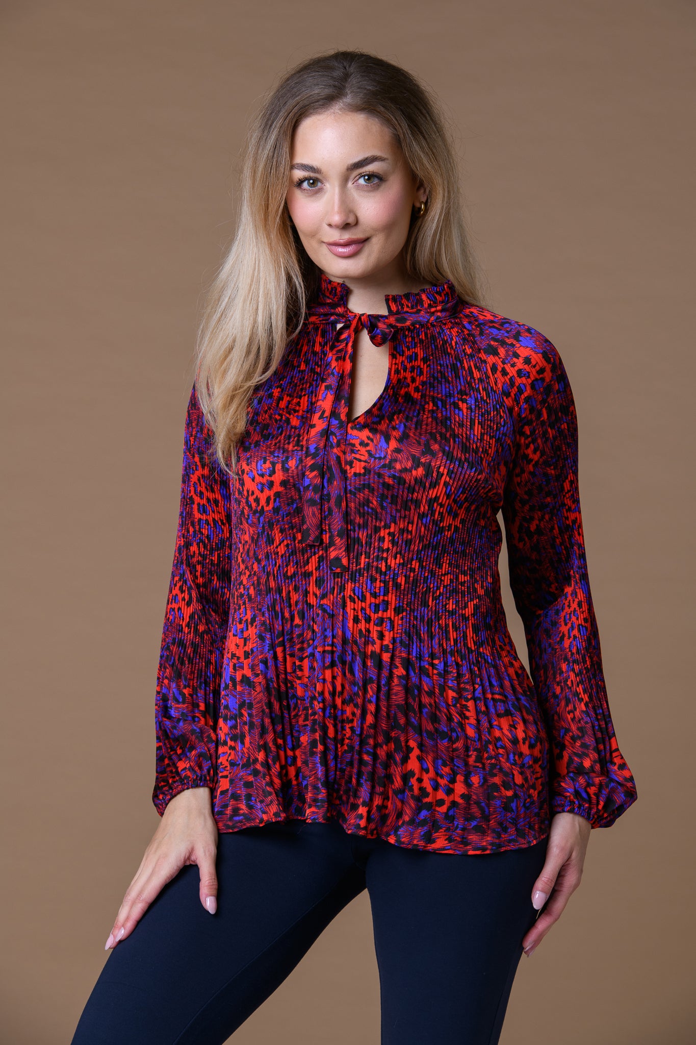 Add a touch of feminine elegance to your wardrobe with our pleated bow top. Featuring soft, delicate pleating and a beautifully gathered bow detail at the neckline, this top brings effortless sophistication to any outfit. The lightweight fabric drapes beautifully, offering a flattering and comfortable fit. Perfect for pairing with tailored trousers for work or dressing up with jeans for an elevated everyday look.