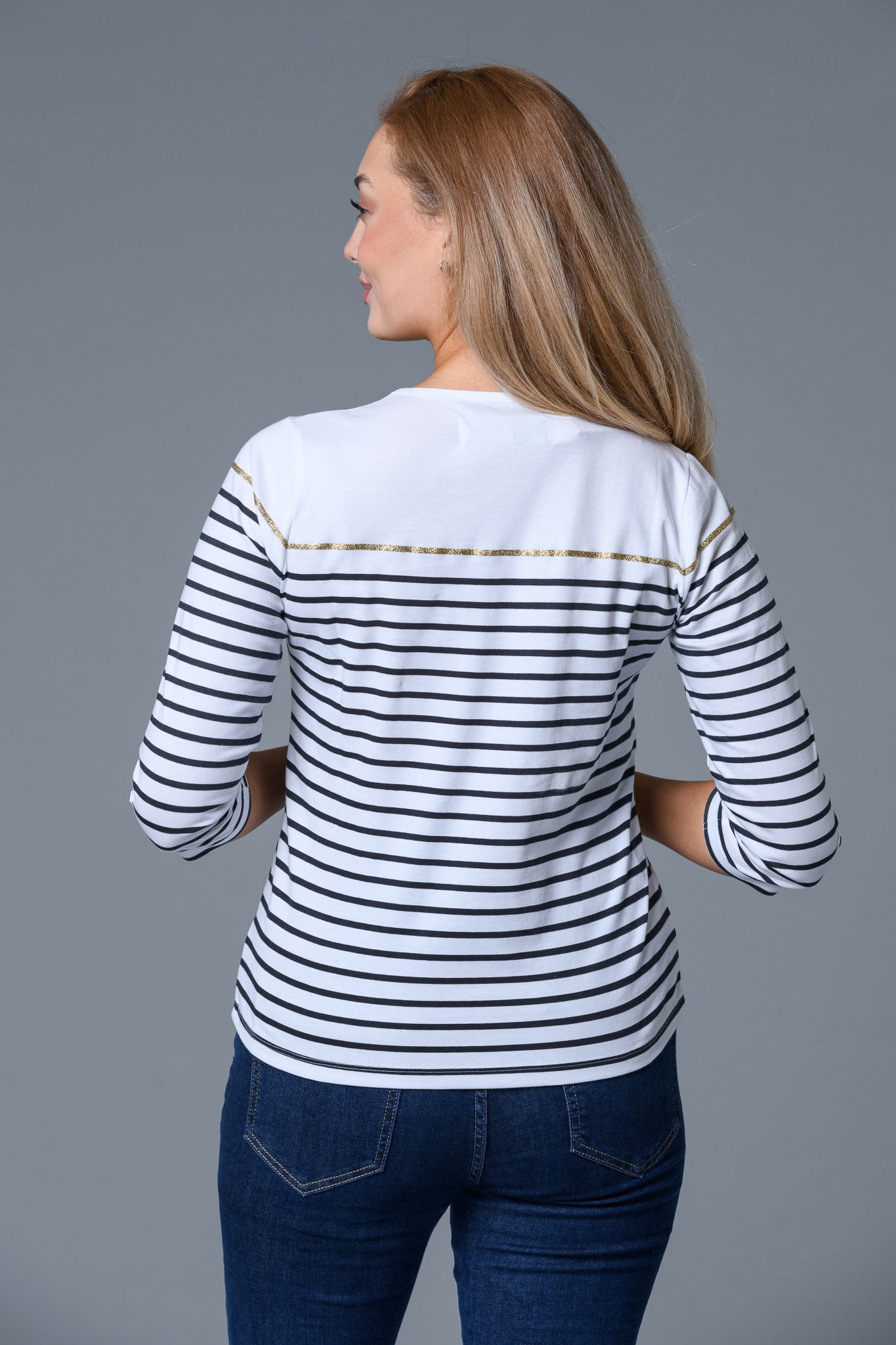 Elevate your wardrobe with this striking Stripe Lurex Top in classic white and navy. The shimmering golden details add a touch of glamour to the crisp striped pattern, making it perfect for both casual outings and special occasions. The luxurious lurex fabric catches the light beautifully, creating an eye-catching shimmer that transforms an everyday top into something truly special. Versatile and sophisticated, this piece pairs effortlessly with your favourite bottoms for an instantly polished look.